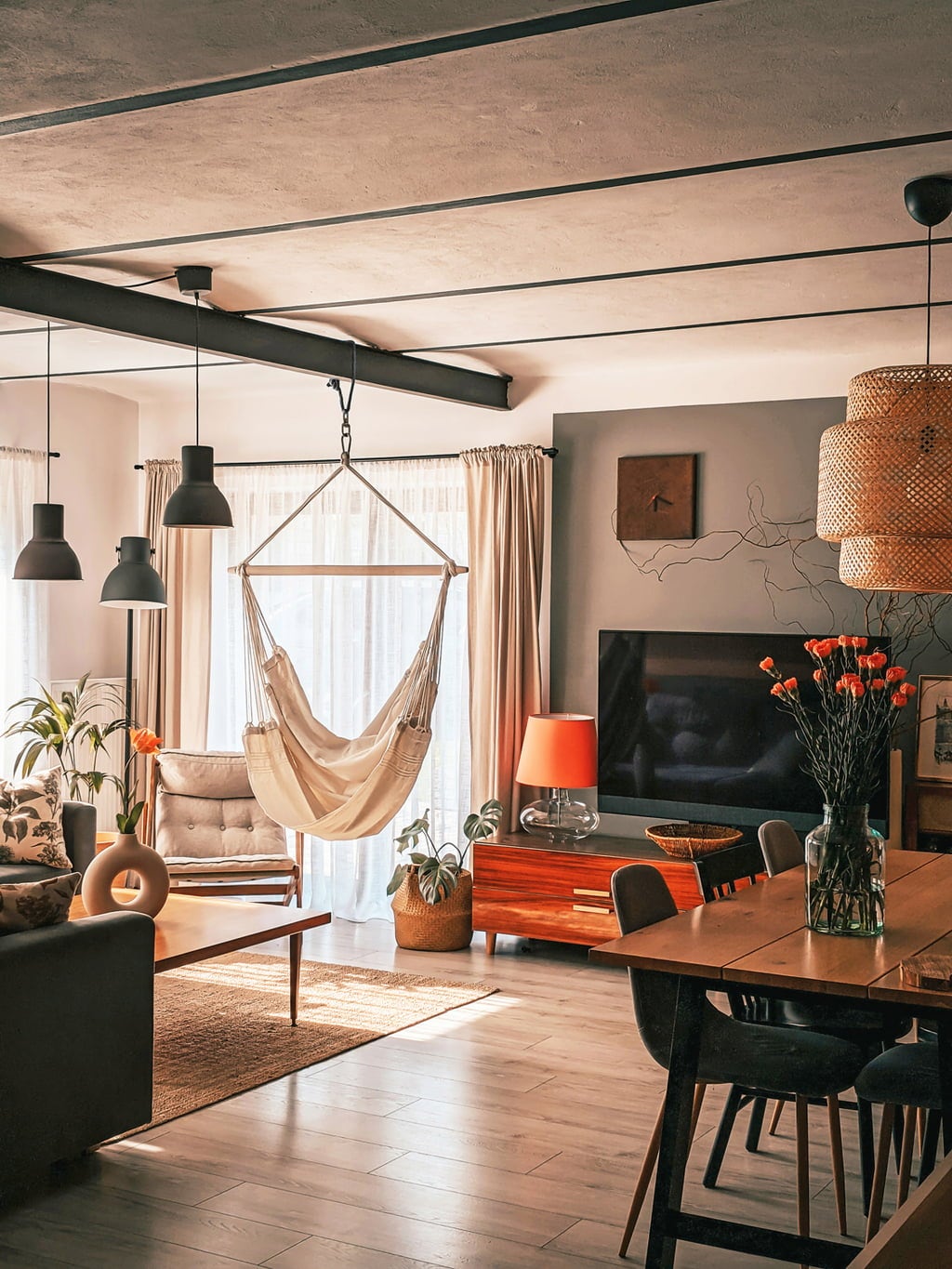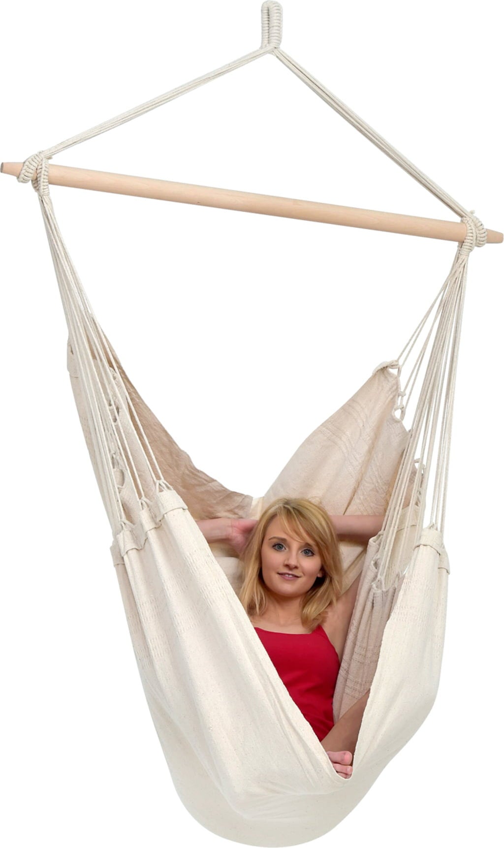 De många upphängningslinorna ger jämn viktfördelning och en underbar känsla av tyngdlöshet. En spridare i bokträ ser till att stolen håller sin form, medan de praktiska urtagen i ändarna håller linorna på plats. Extra tjocka snören och förstärkta, handvävda öglor ger lång hållbarhet. Den täta väven på 400 g/m² bär upp till 150 kg utan problem – perfekt för dig som vill koppla av med stil och kvalitet.