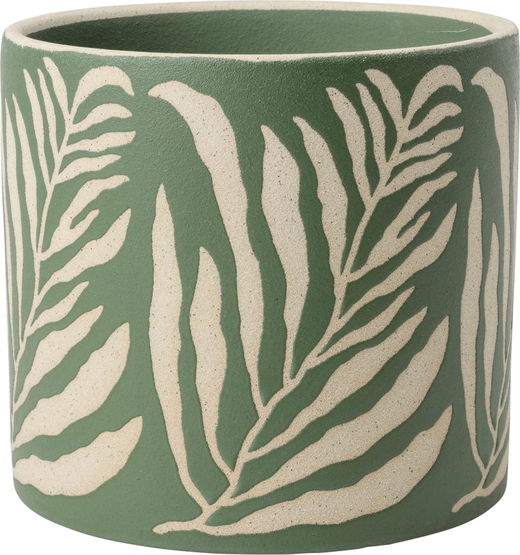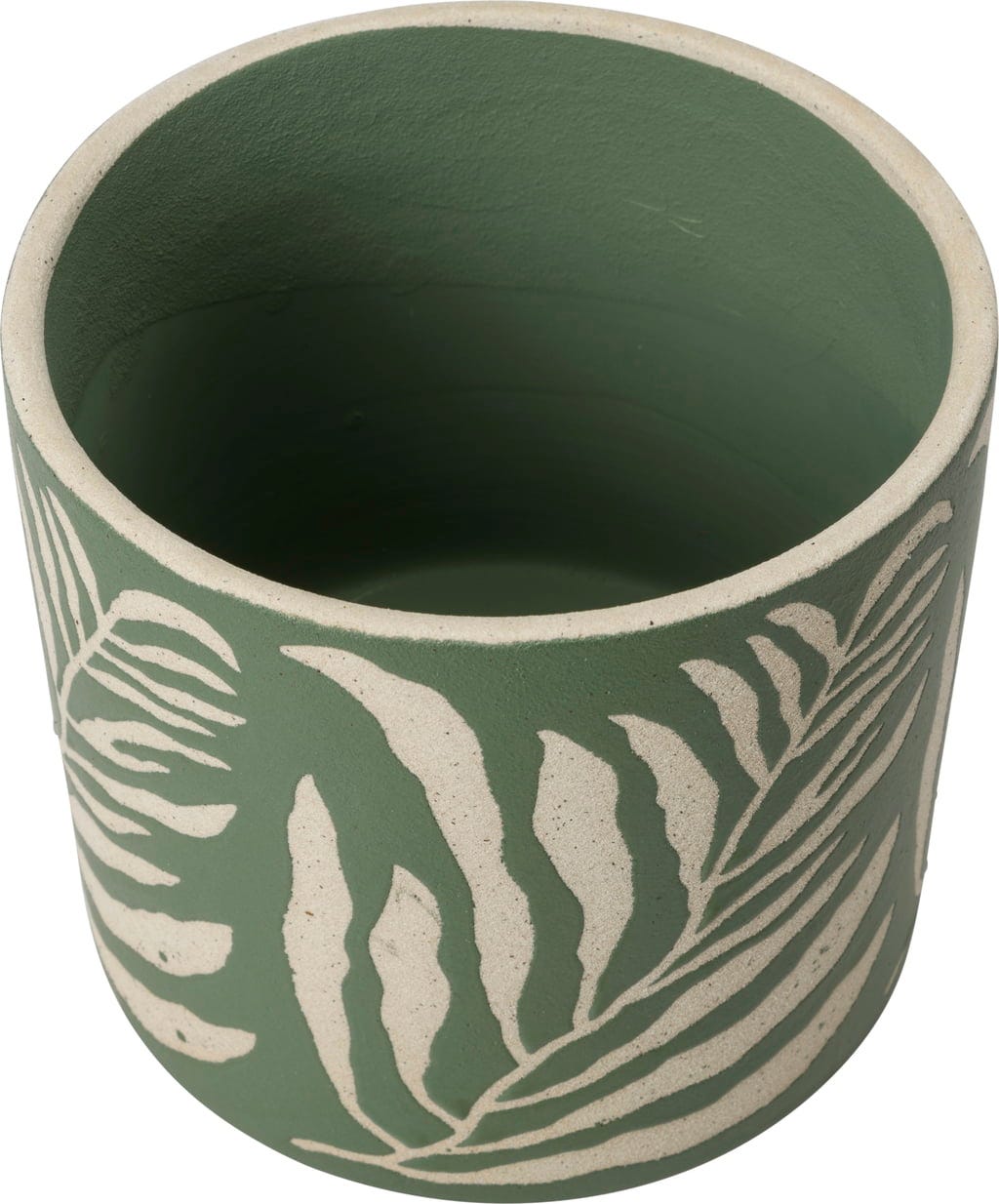 Med denna stilfulla inomhuskruka i stengods adderar du en fräsch och elegant känsla till hemmet. Den lätt strukturerade ytan och den matta glasyren i mjukt grönt lyfter fram det oglaserade bladmönstret på ett konstnärligt sätt – en harmonisk kombination av färg, textur och form.