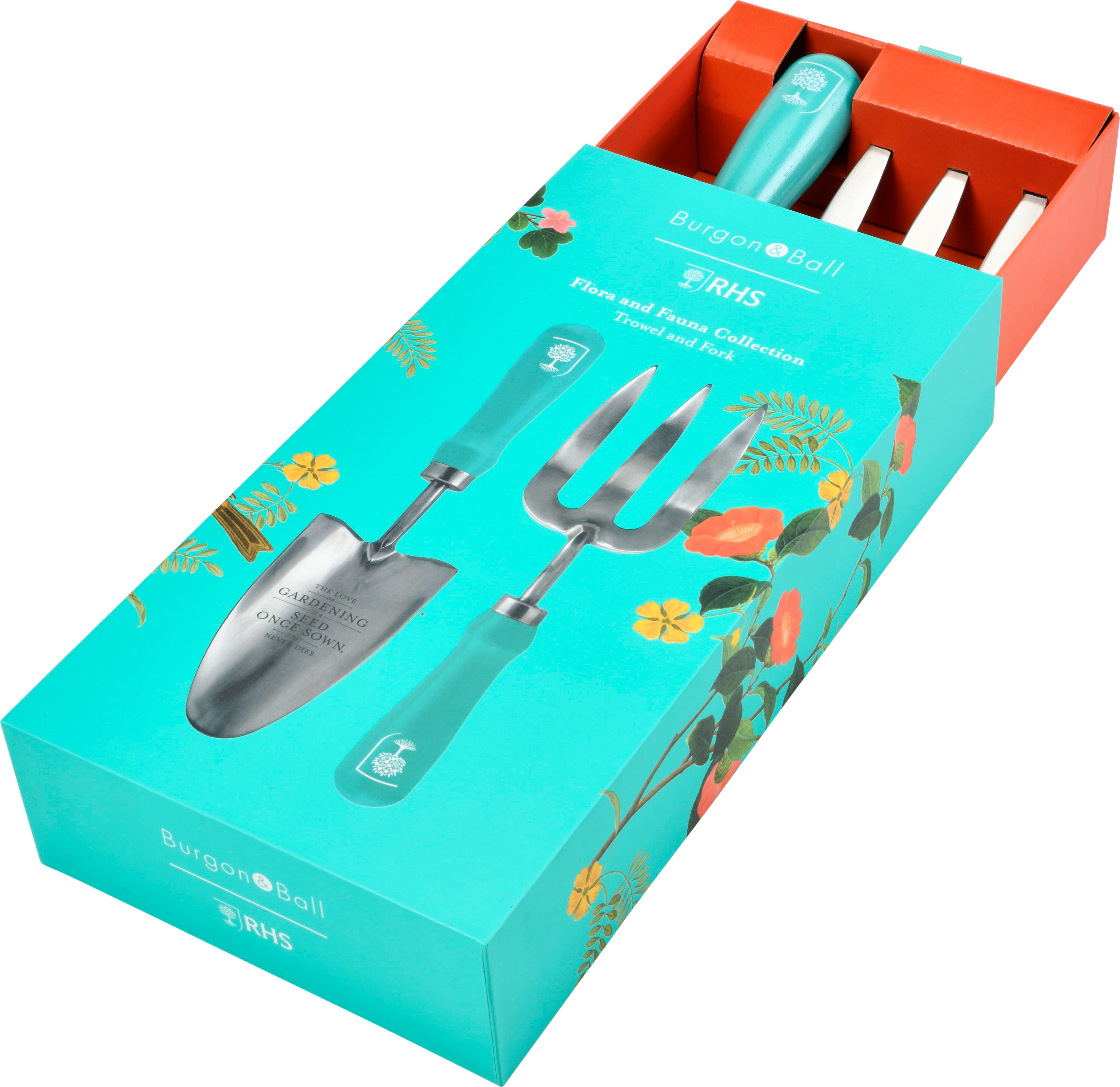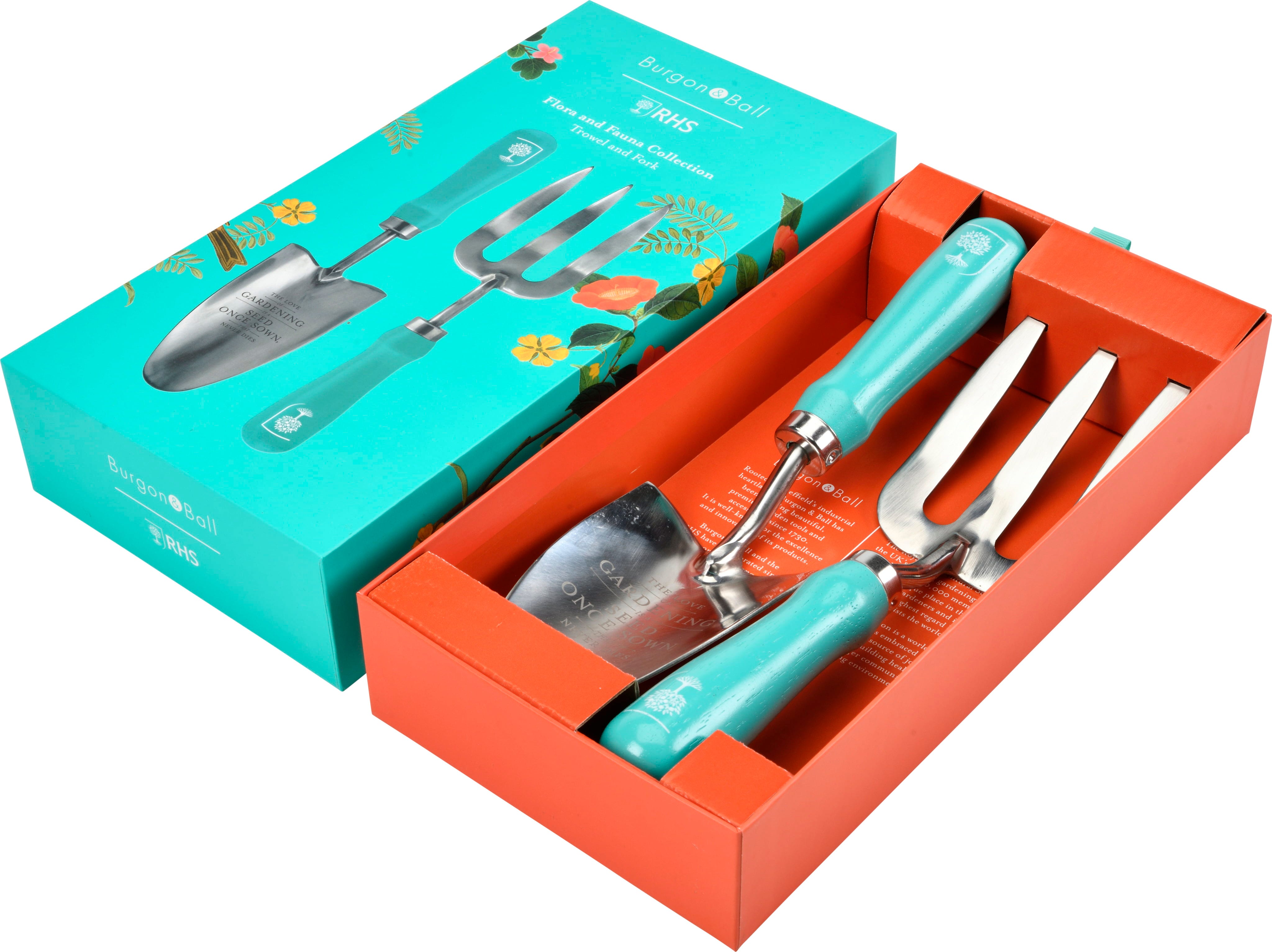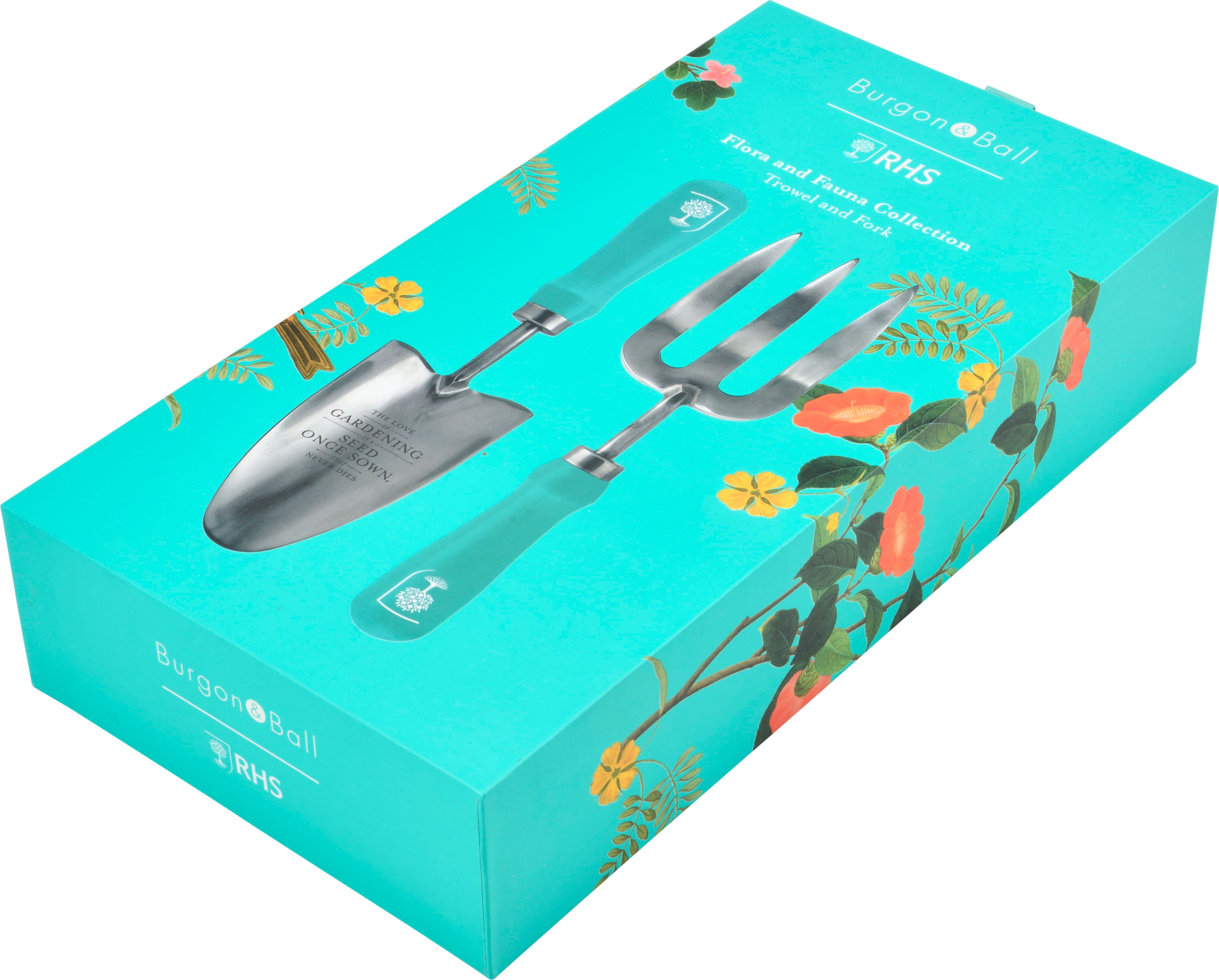 Lyft din trädgårdsskötsel med denna exklusiva duo från Burgon & Ball som förenar funktionalitet med historisk estetik. Spaden och planteringsgaffeln i högkvalitativt rostfritt stål pryds av en fin fjärilsgravyr på spadbladet. De färglackerade handtagen i hållbart lövträ ligger bekvämt i handen och speglar den eleganta designen ”Flora & Fauna”, baserad på klassiska illustrationer.