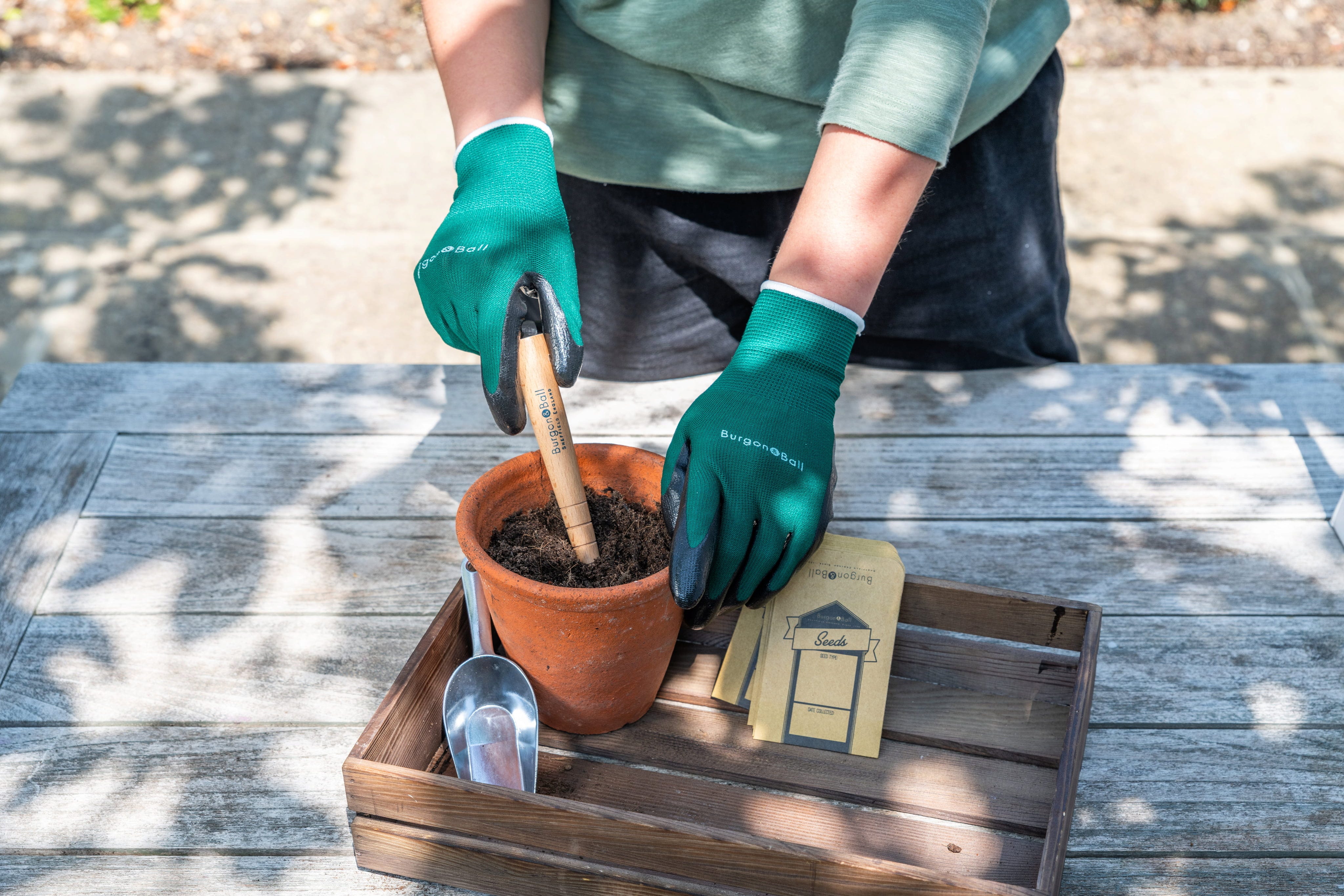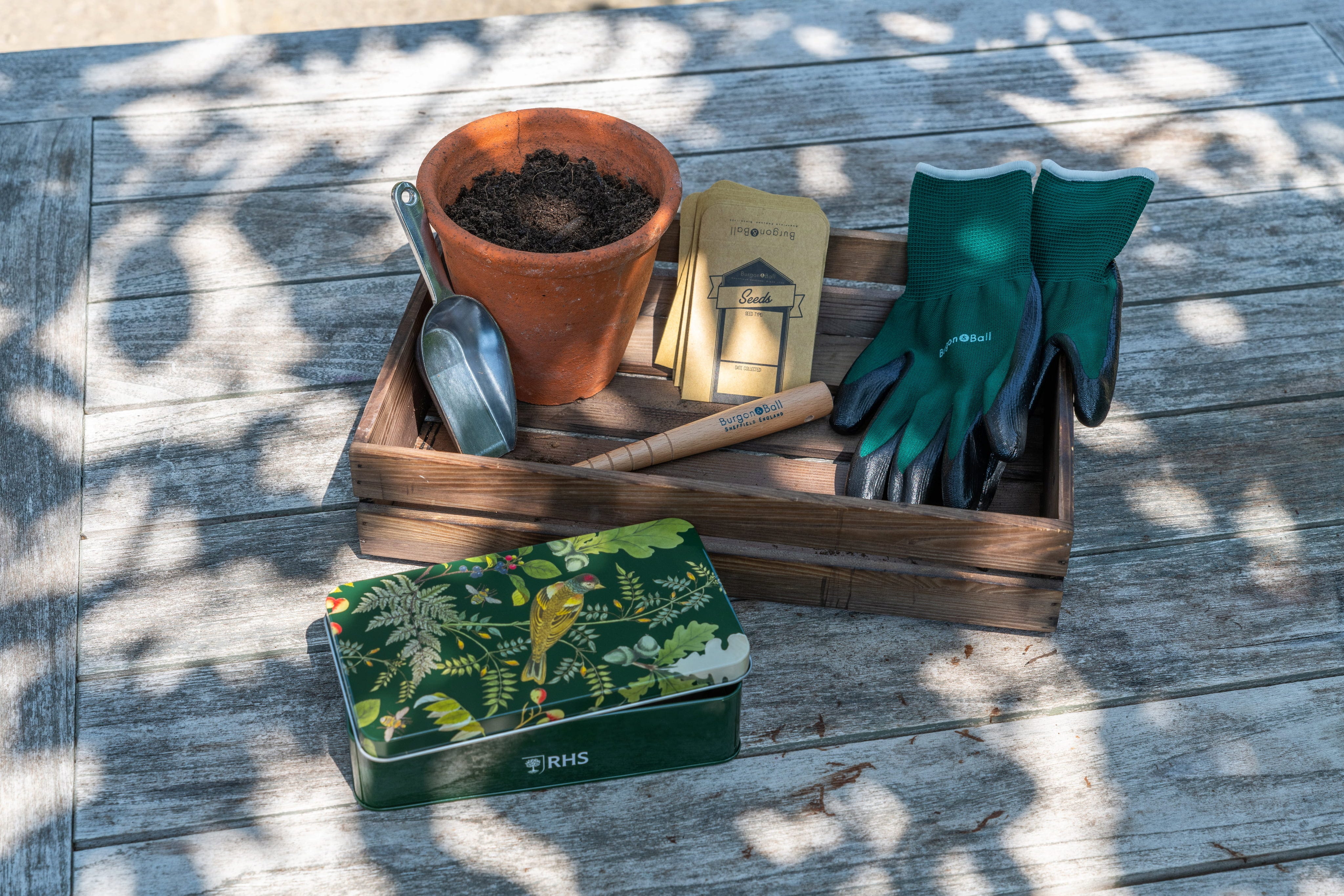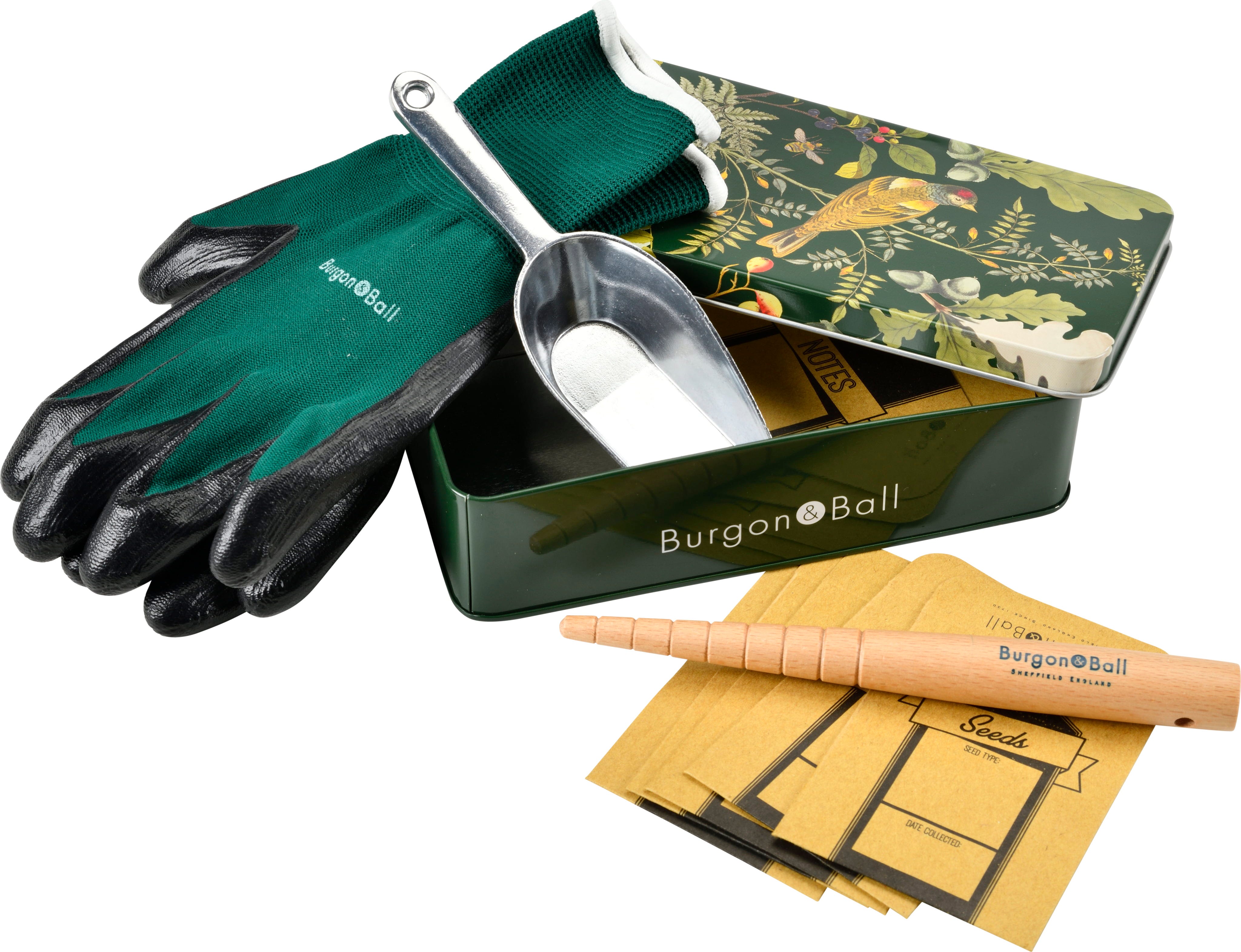 Starta perfekt inför trädgårdssäsongen med detta genomtänkta såset från Burgon & Ball! I den vackert dekorerade plåtburken hittar du allt du behöver för att driva upp dina plantor: en precisionsspade i aluminium, en planteringspinne i trä för större frön samt robusta papperspåsar för ditt utsäde. Matchande stretchhandskar med skyddande nitrilbeläggning kompletterar setet.