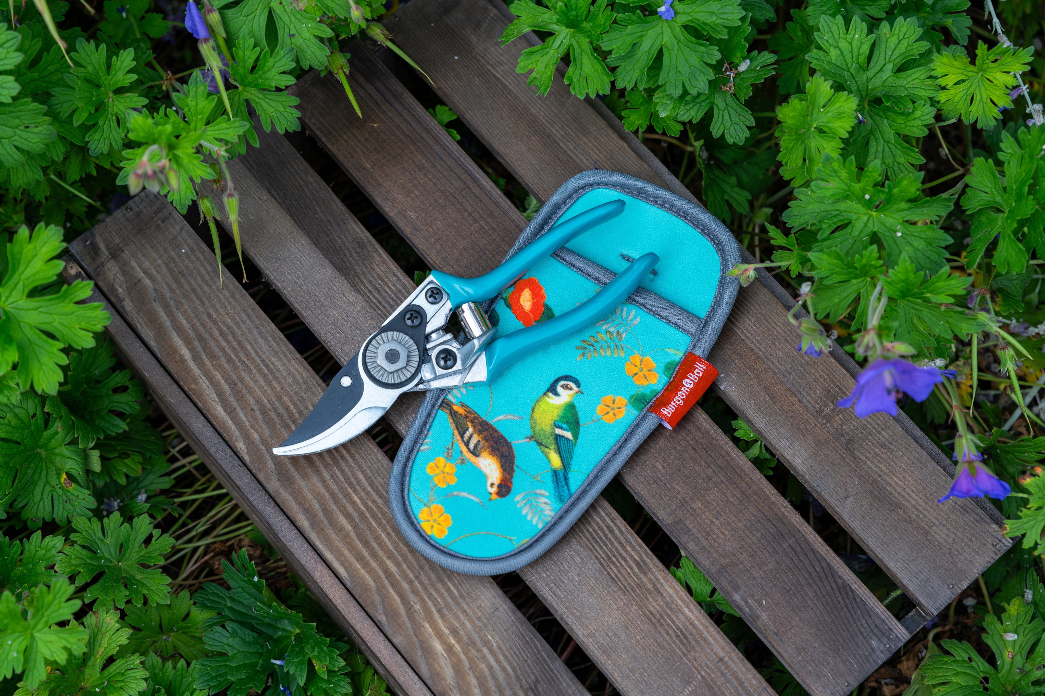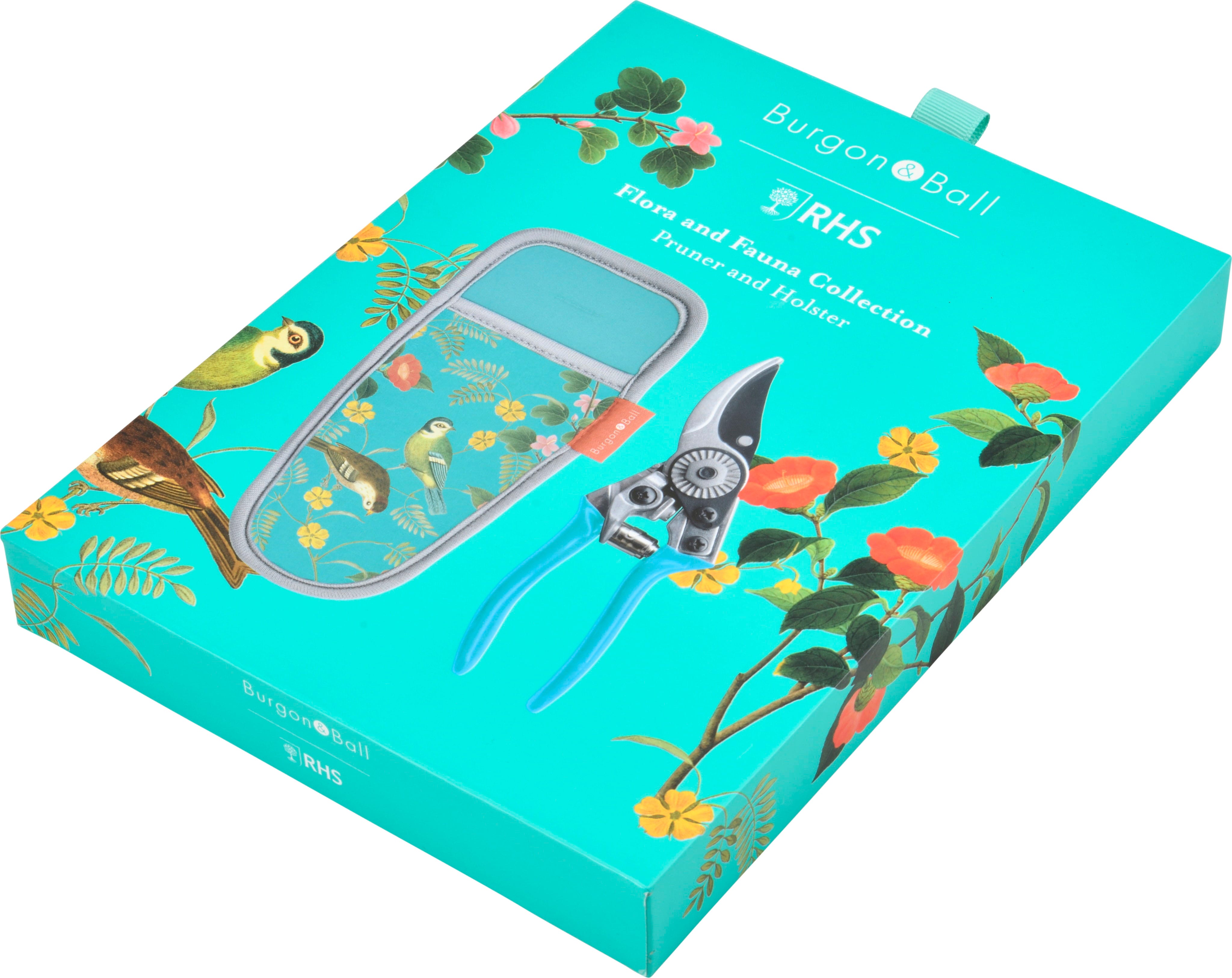 För att du alltid ska ha verktyget nära till hands ingår ett matchande neoprenhölster med dekorativa motiv från ”Flora & Fauna” ur RHS historiska arkiv. Hölstret kan enkelt fästas i bältet och skyddar saxen medan du rör dig fritt i trädgården.