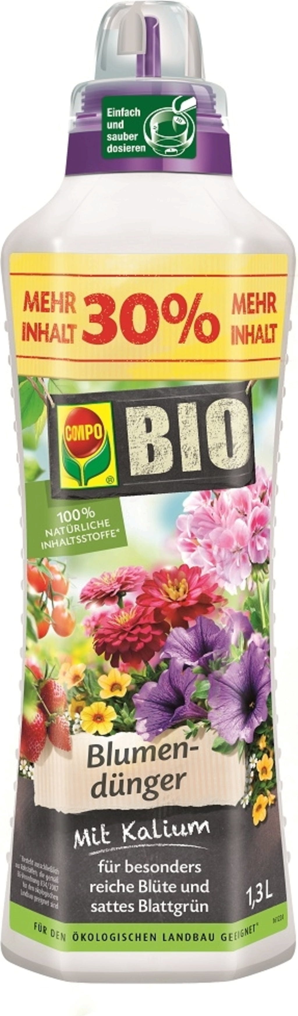 COMPO BIO Blomnäring har en balanserad näringsformel med kalium. Kaliuminnehållet i den flytande näringen främjar en rik och intensiv blomning. Universalnäringen verkar omedelbart. För en jämn näringstillförsel bör gödslingen upprepas efter en vecka under säsong.