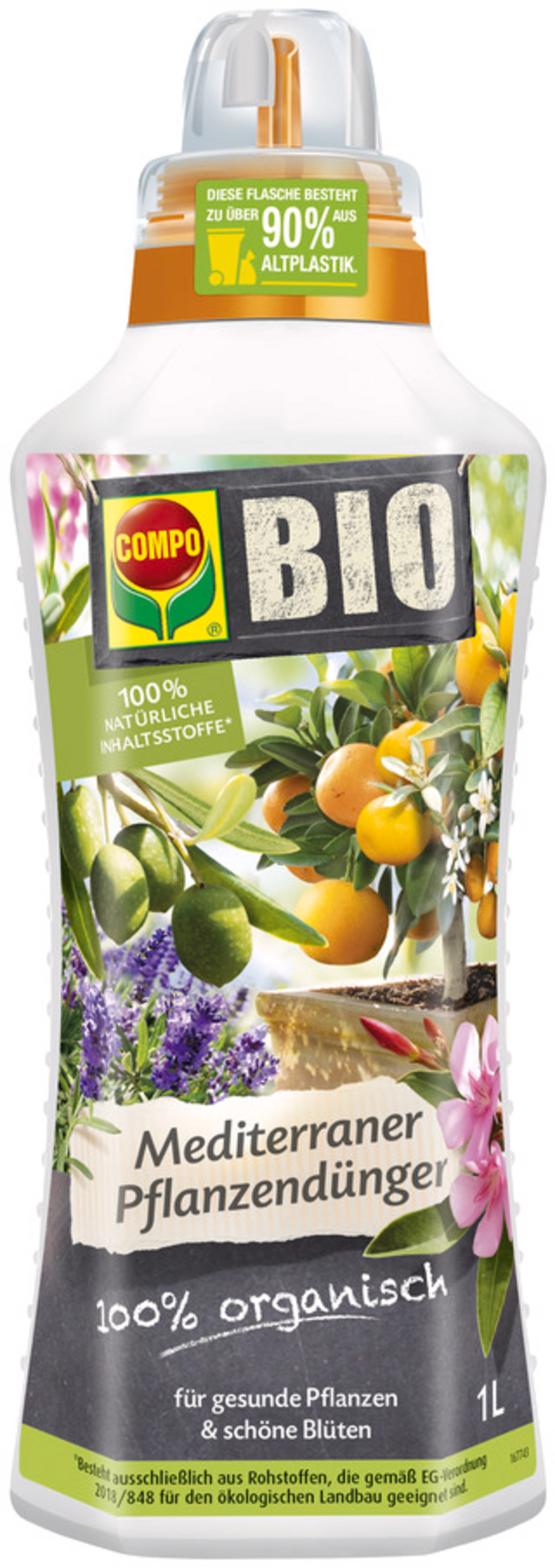 EKO Medelhavsnäring från COMPO ger en anpassad näringsformel för alla medelhavsväxter som apelsin- och olivträd, lavendel och oleander. Den består helt av naturliga råvaror och bidrar till kraftiga plantor, god fruktsättning och rik blomning.