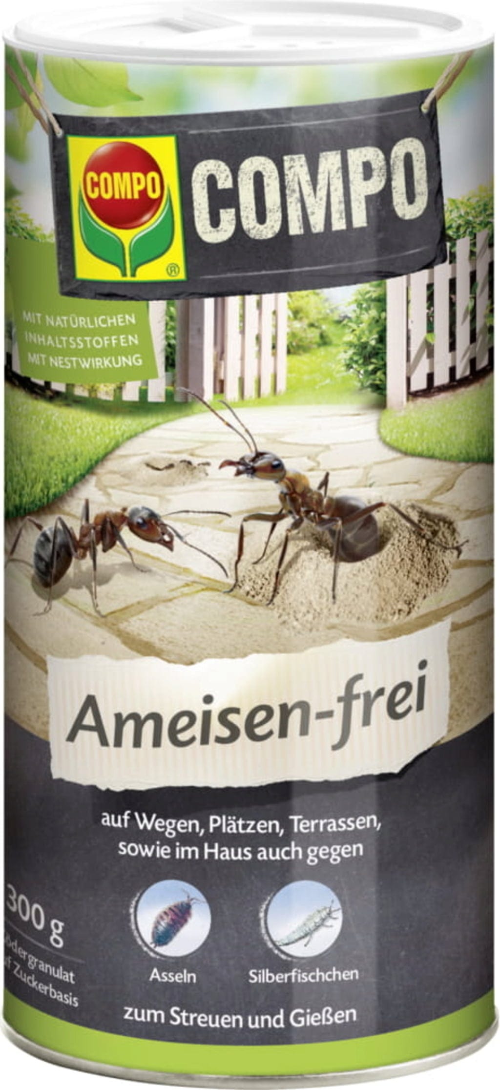 Myrfri N (Ameisen-frei N) granulat verkar tillförlitligt mot myror på gångar, torg, inomhus och på terrassen.