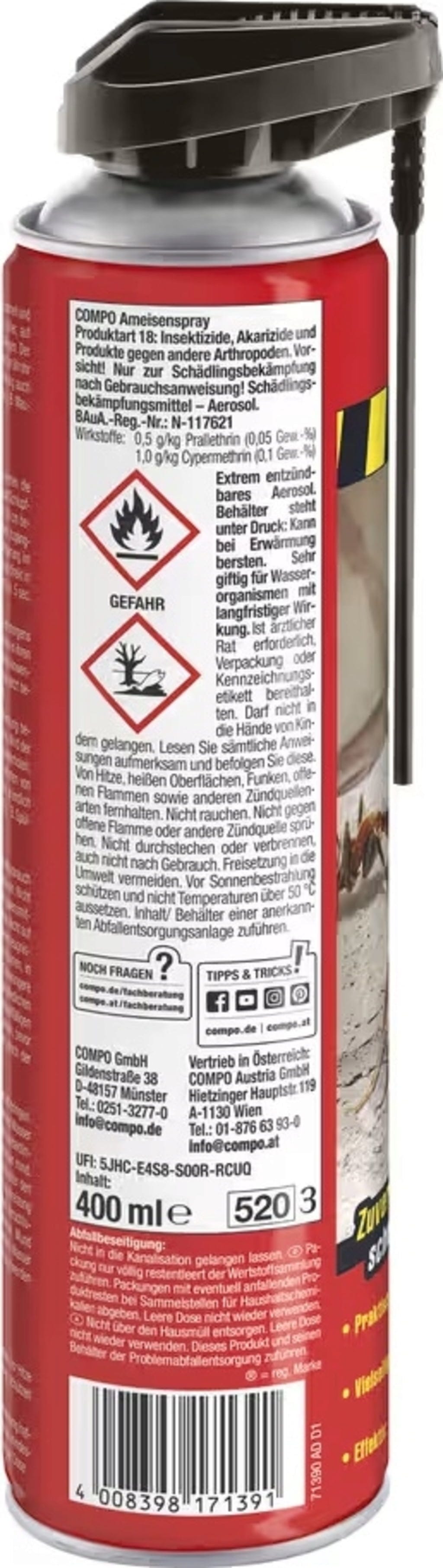 COMPO myrspray ger en snabb och långvarig lösning mot myrangrepp och andra krypande insekter. Den specialanpassade kombinationen av verksamma ämnen ger tillförlitlig effekt, medan det praktiska spruthuvudet når även svåråtkomliga områden som springor och fogar. För ett effektivt skydd i hemmet och utomhus.