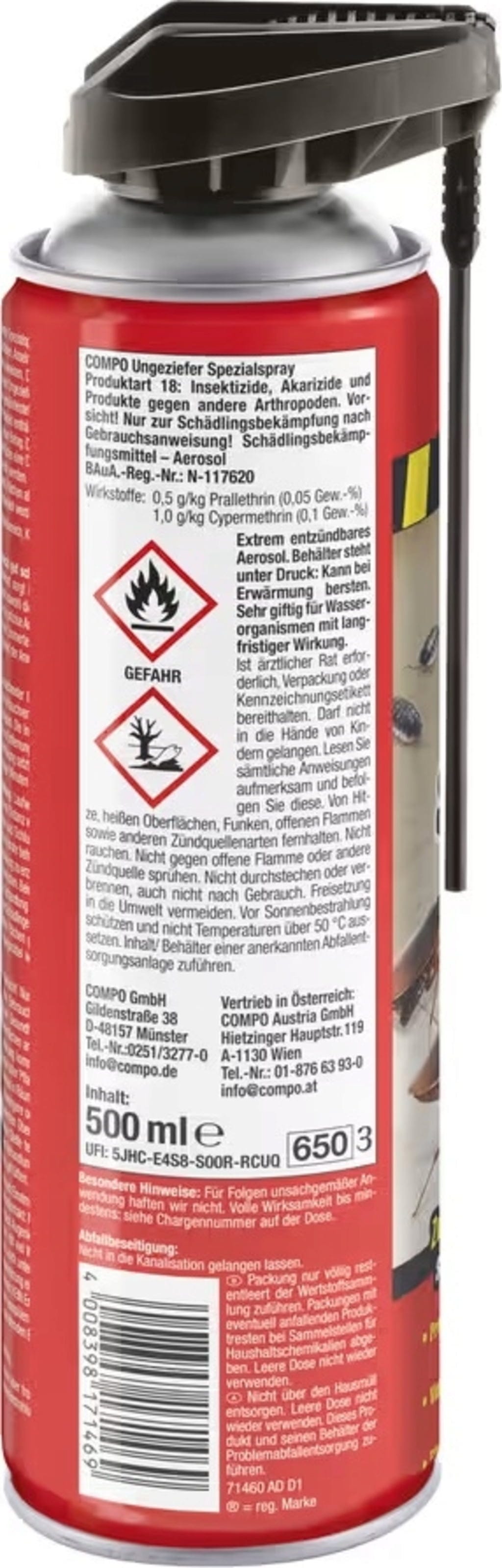 COMPO Specialspray mot ohyra bekämpar krypande skadedjur snabbt och effektivt. Den kraftfulla kombinationen av aktiva ämnen ger omedelbar effekt och långvarigt skydd. Tack vare det specialutformade munstycket kan även svåråtkomliga områden behandlas exakt.