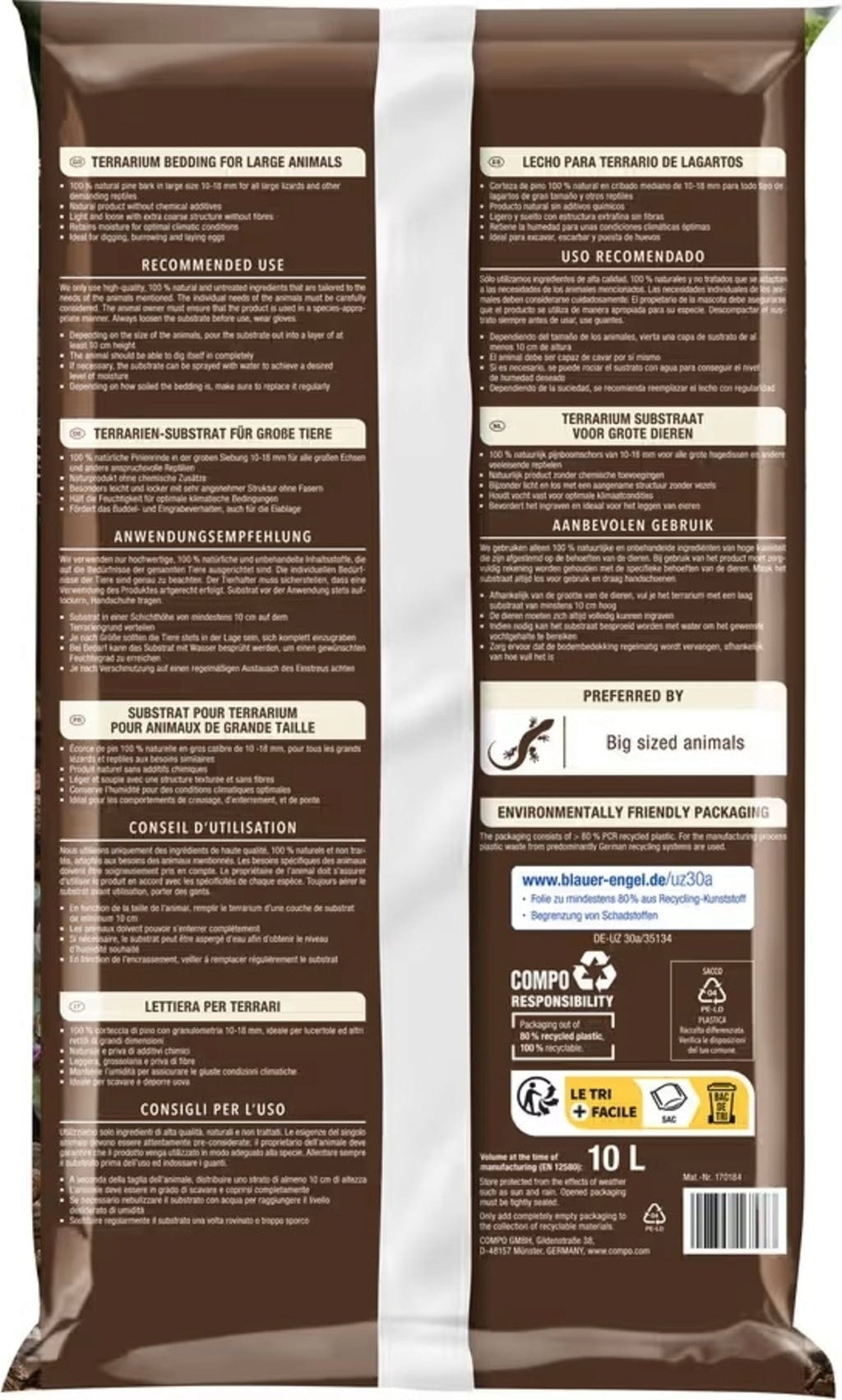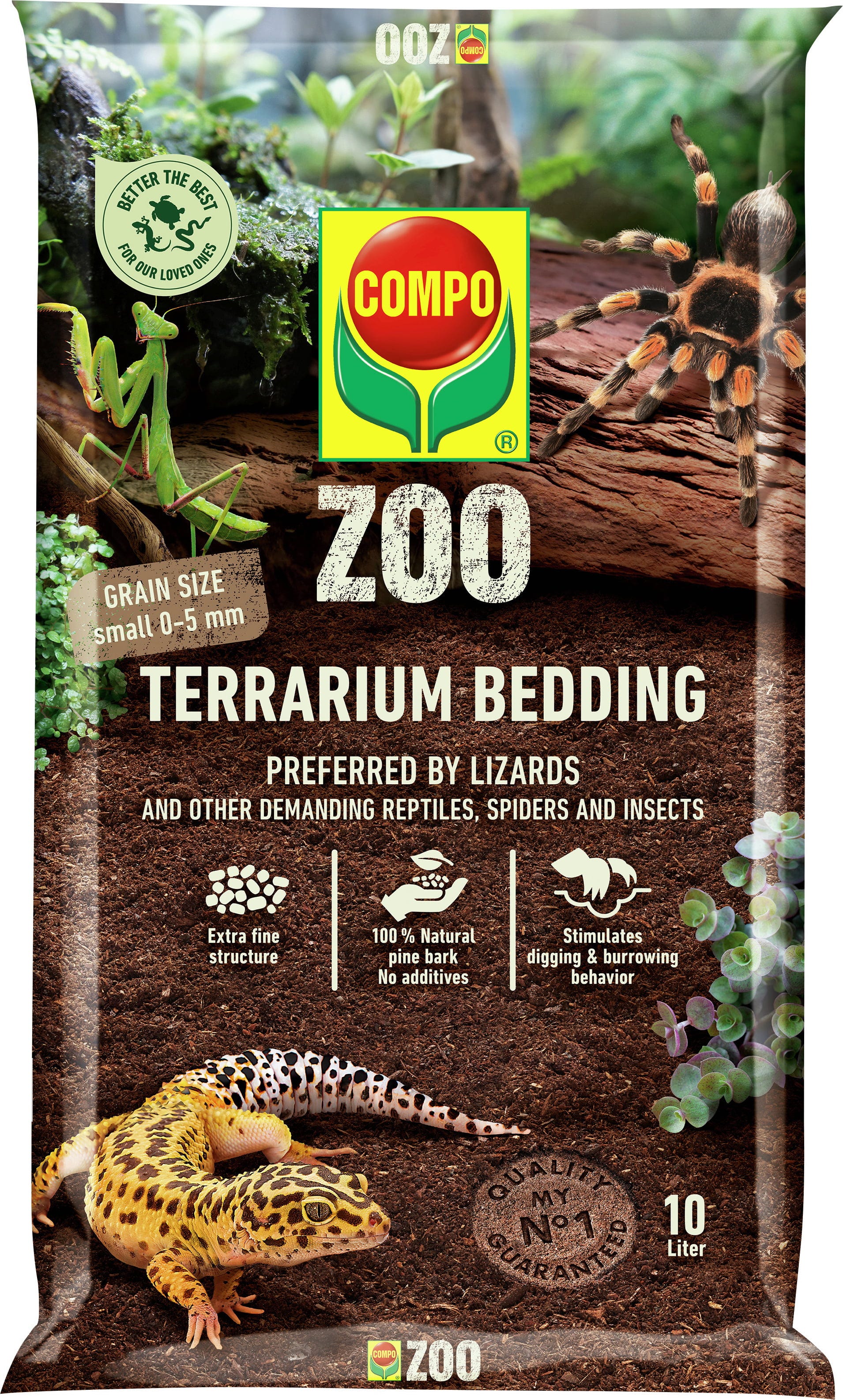 COMPO ZOO Terrariesubstrat för små och stora djur ger perfekta förutsättningar för ödlor, amfibier och ryggradslösa djur. Den extra fina pinjebarken är särskilt luftig och lätt, vilket gör att djuren kan gräva ner sig, böka eller lägga ägg. Samtidigt bidrar substratet till ett stabilt klimat i terrariet - helt utan kemiska tillsatser.