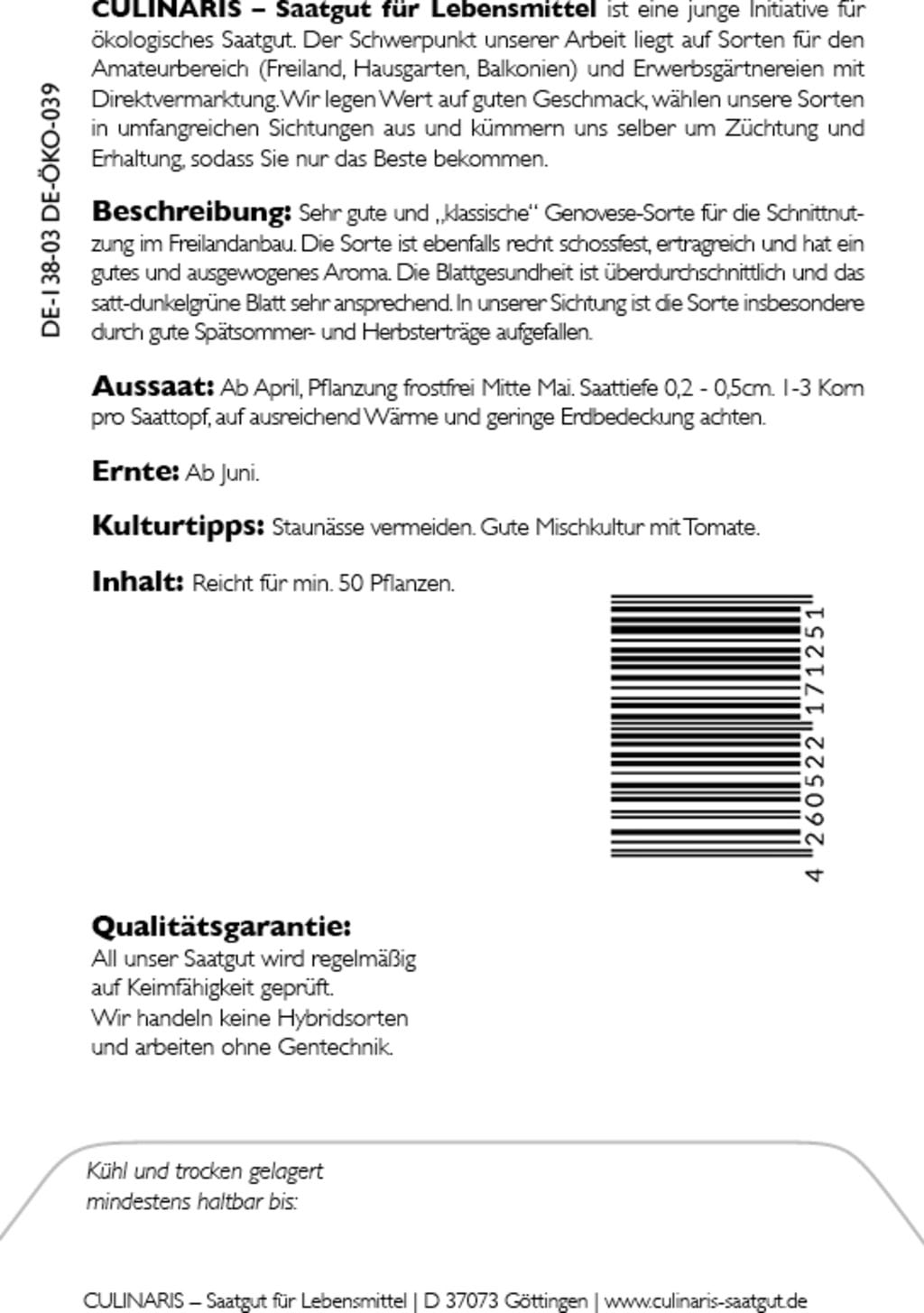 Denna skottfasta och högavkastande sort av Genovesertyp lämpar sig utmärkt för frilandsodling och producerar rikligt med blad med balanserad smak. Särskilt under sensommaren och hösten ger den mycket god skörd.