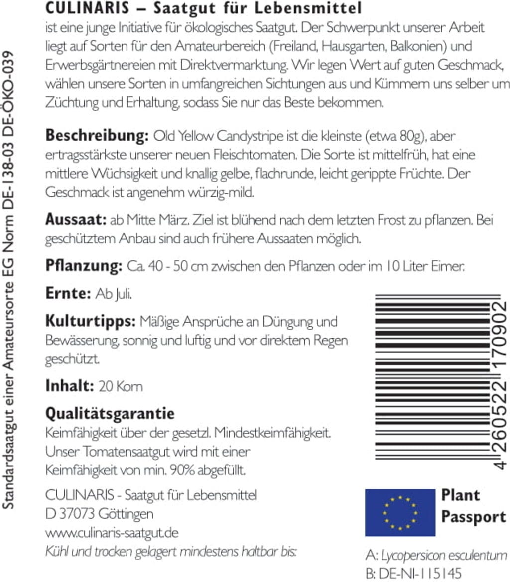 | Tillverkare: | Culinaris - Saatgut für Lebensmittel, Thiegasse 5, 37124, Rosdorf, Tyskland, info@culinaris-saatgut.de, culinaris-saatgut.de |