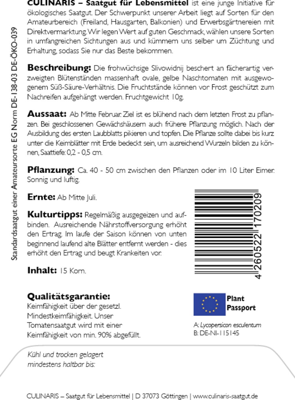 | Tillverkare: | Culinaris - Saatgut für Lebensmittel, Thiegasse 5, 37124, Rosdorf, Tyskland, info@culinaris-saatgut.de, culinaris-saatgut.de |