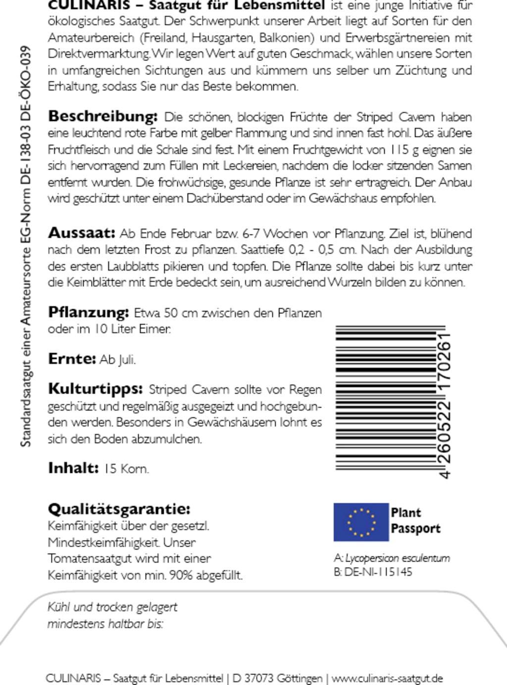 | Tillverkare: | Culinaris - Saatgut für Lebensmittel, Thiegasse 5, 37124, Rosdorf, Tyskland, info@culinaris-saatgut.de, culinaris-saatgut.de |