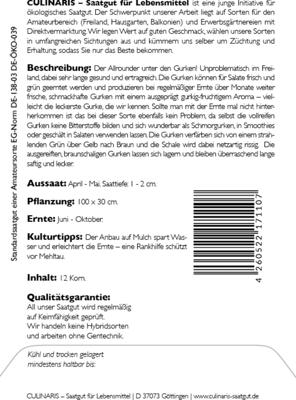 | Tillverkare: | Culinaris - Saatgut für Lebensmittel, Thiegasse 5, 37124, Rosdorf, Tyskland, info@culinaris-saatgut.de, culinaris-saatgut.de |