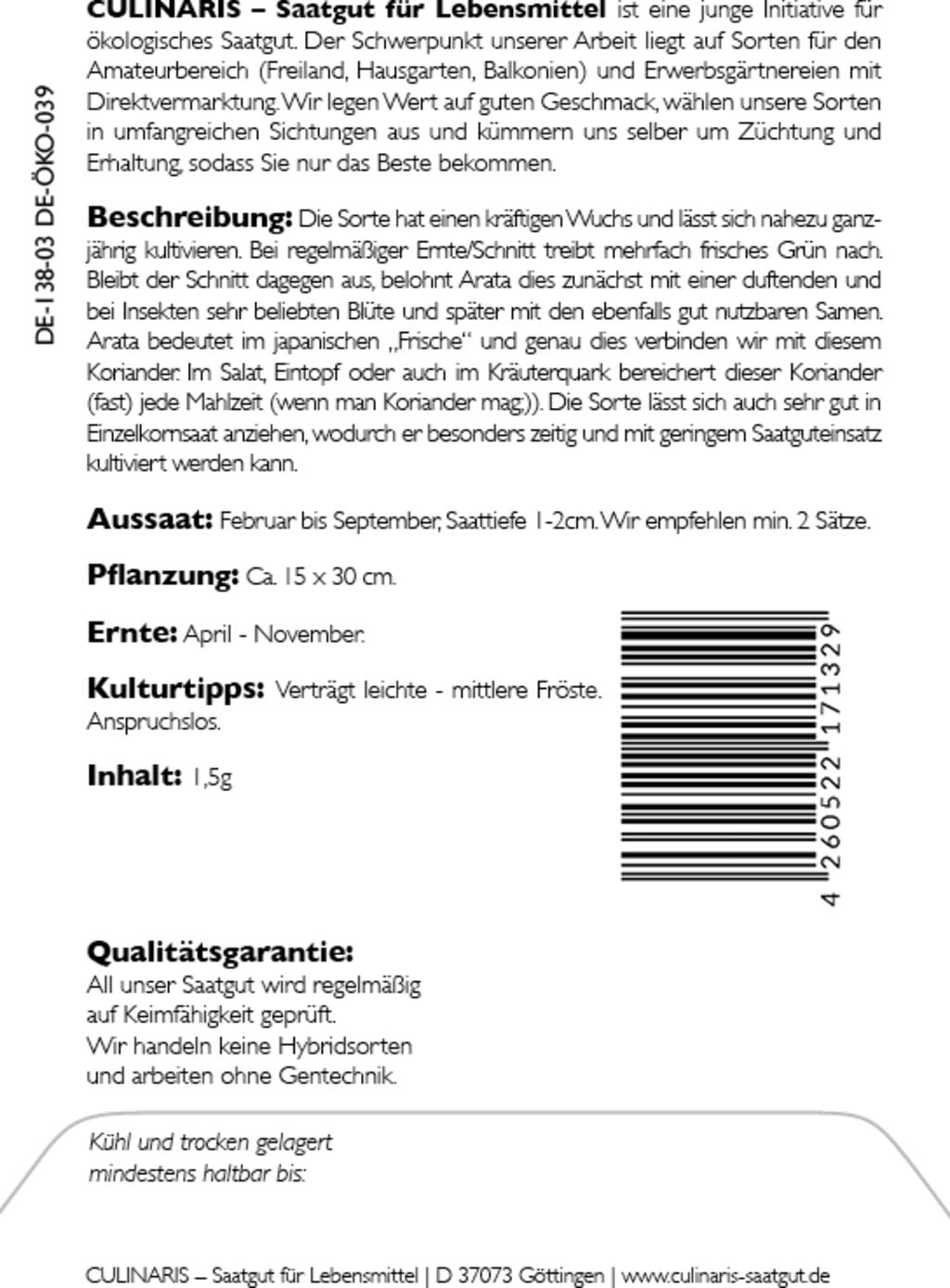 | Tillverkare: | Culinaris - Saatgut für Lebensmittel, Thiegasse 5, 37124, Rosdorf, Tyskland, info@culinaris-saatgut.de, culinaris-saatgut.de |