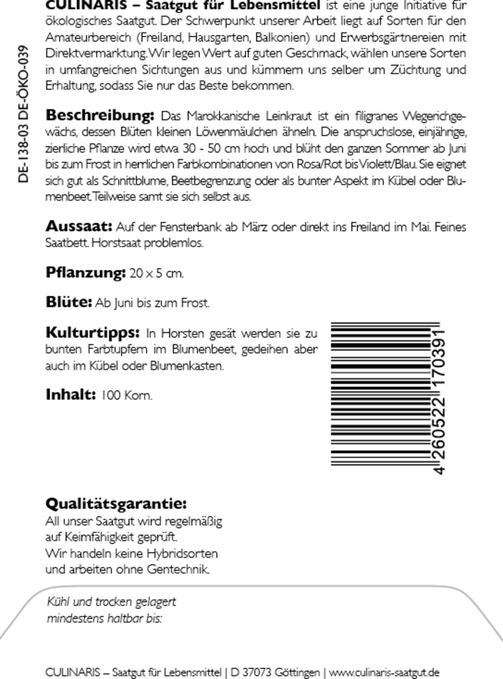 | Tillverkare: | Culinaris - Saatgut für Lebensmittel, Thiegasse 5, 37124, Rosdorf, Tyskland, info@culinaris-saatgut.de, culinaris-saatgut.de |