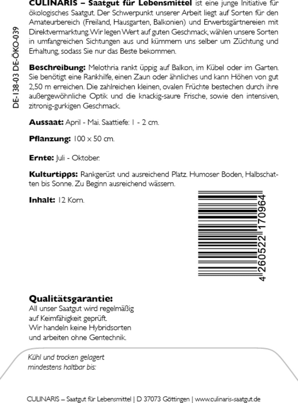 | Tillverkare: | Culinaris - Saatgut für Lebensmittel, Thiegasse 5, 37124, Rosdorf, Tyskland, info@culinaris-saatgut.de, culinaris-saatgut.de |