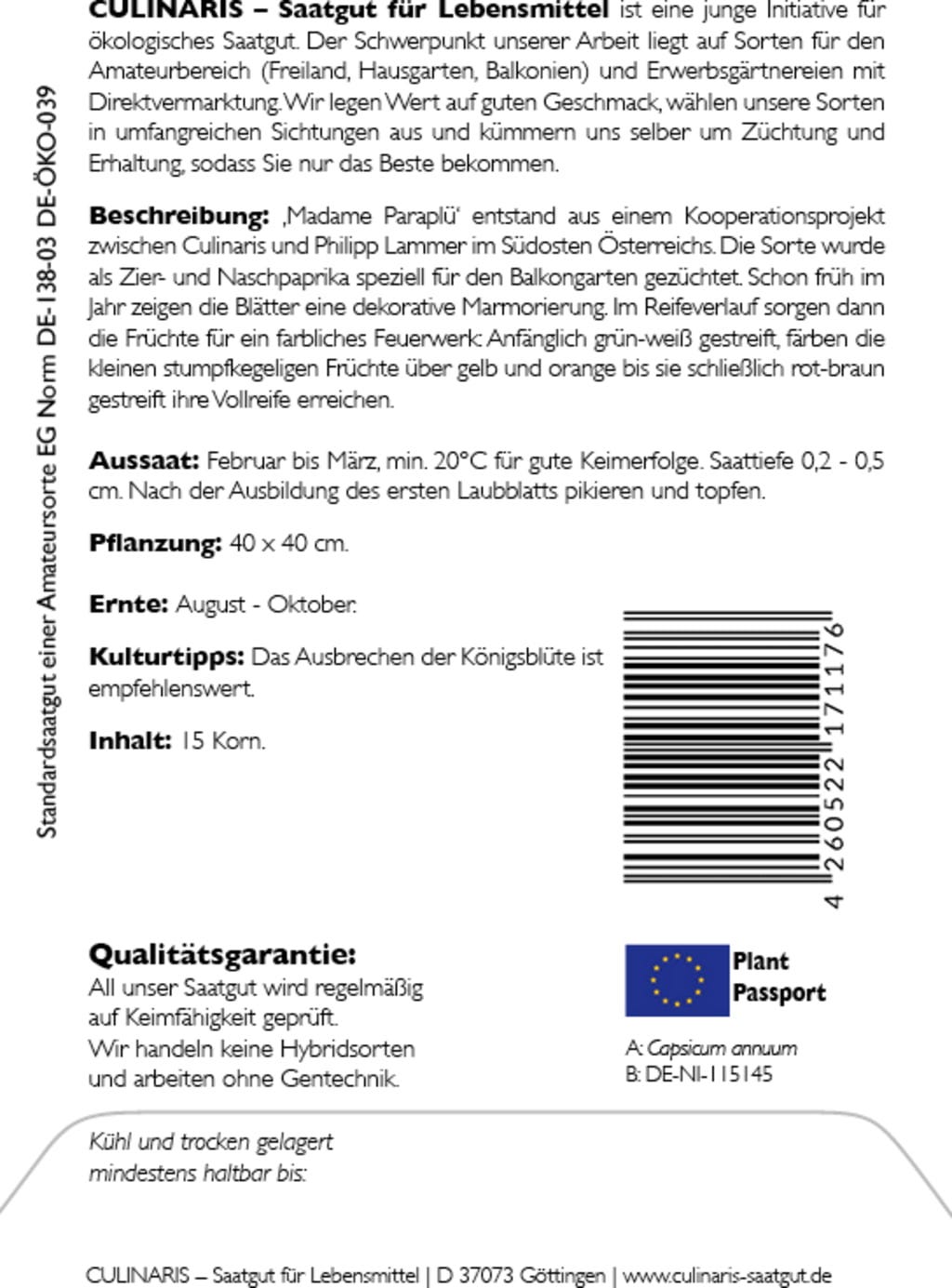 | Tillverkare: | Culinaris - Saatgut für Lebensmittel, Thiegasse 5, 37124, Rosdorf, Tyskland, info@culinaris-saatgut.de, culinaris-saatgut.de |