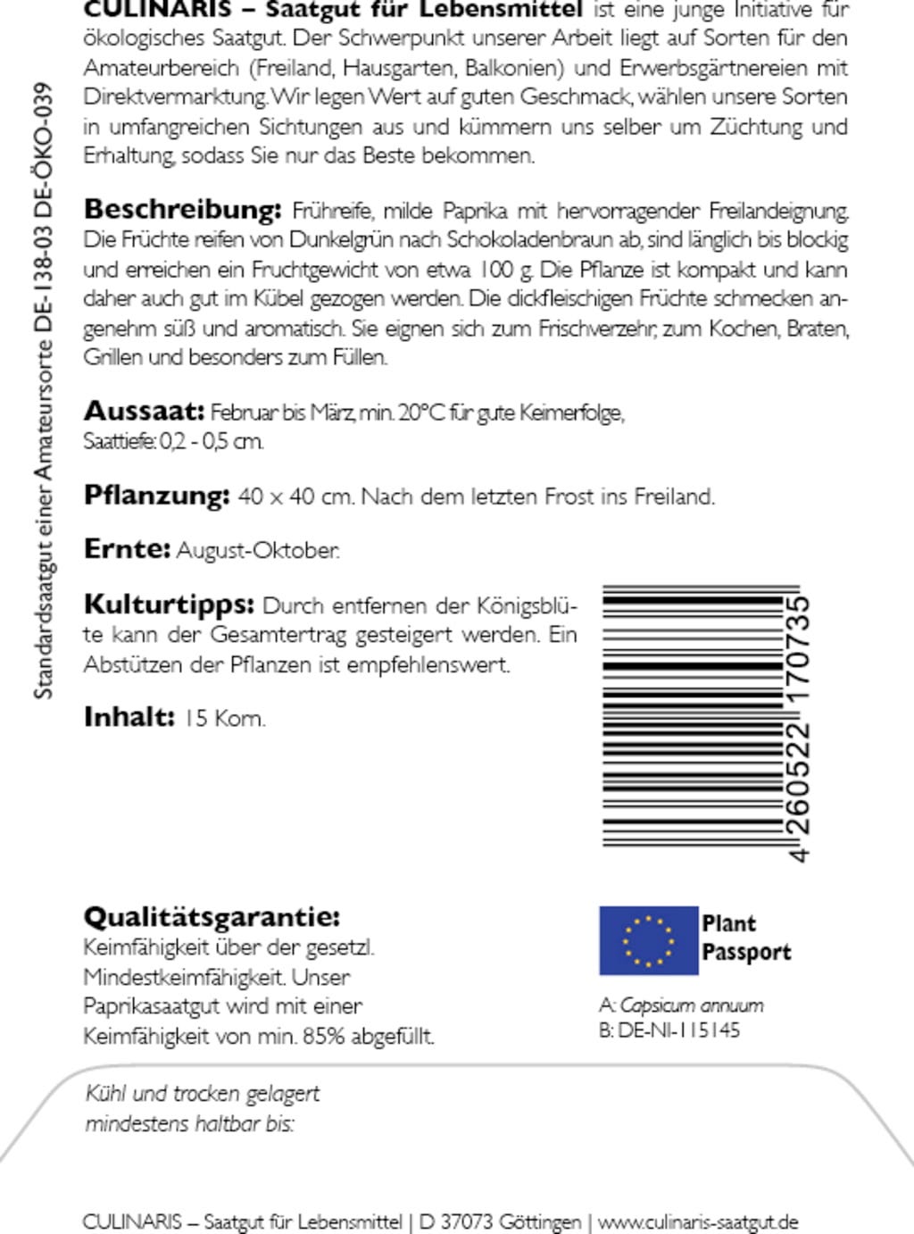 | Tillverkare: | Culinaris - Saatgut für Lebensmittel, Thiegasse 5, 37124, Rosdorf, Tyskland, info@culinaris-saatgut.de, culinaris-saatgut.de |