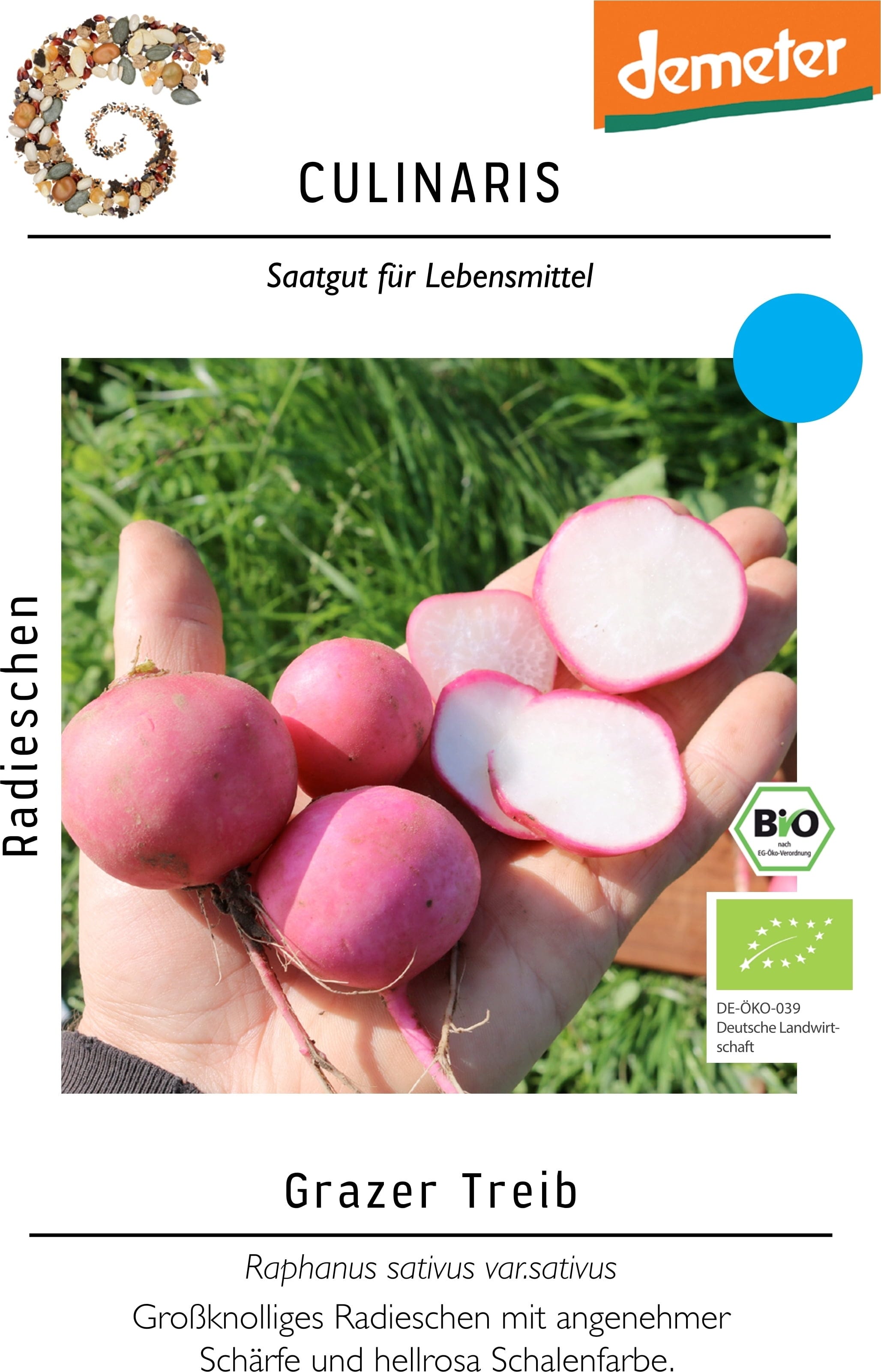 Rädisan Grazer Treib imponerar med ovanligt stora knölar och en vacker, ljusrosa färg. Smakmässigt utmärker sig sorten med en behagligt balanserad hetta och en frisk, kraftfull arom - perfekt för sallader, smörgåsar eller som ett krispigt mellanmål.