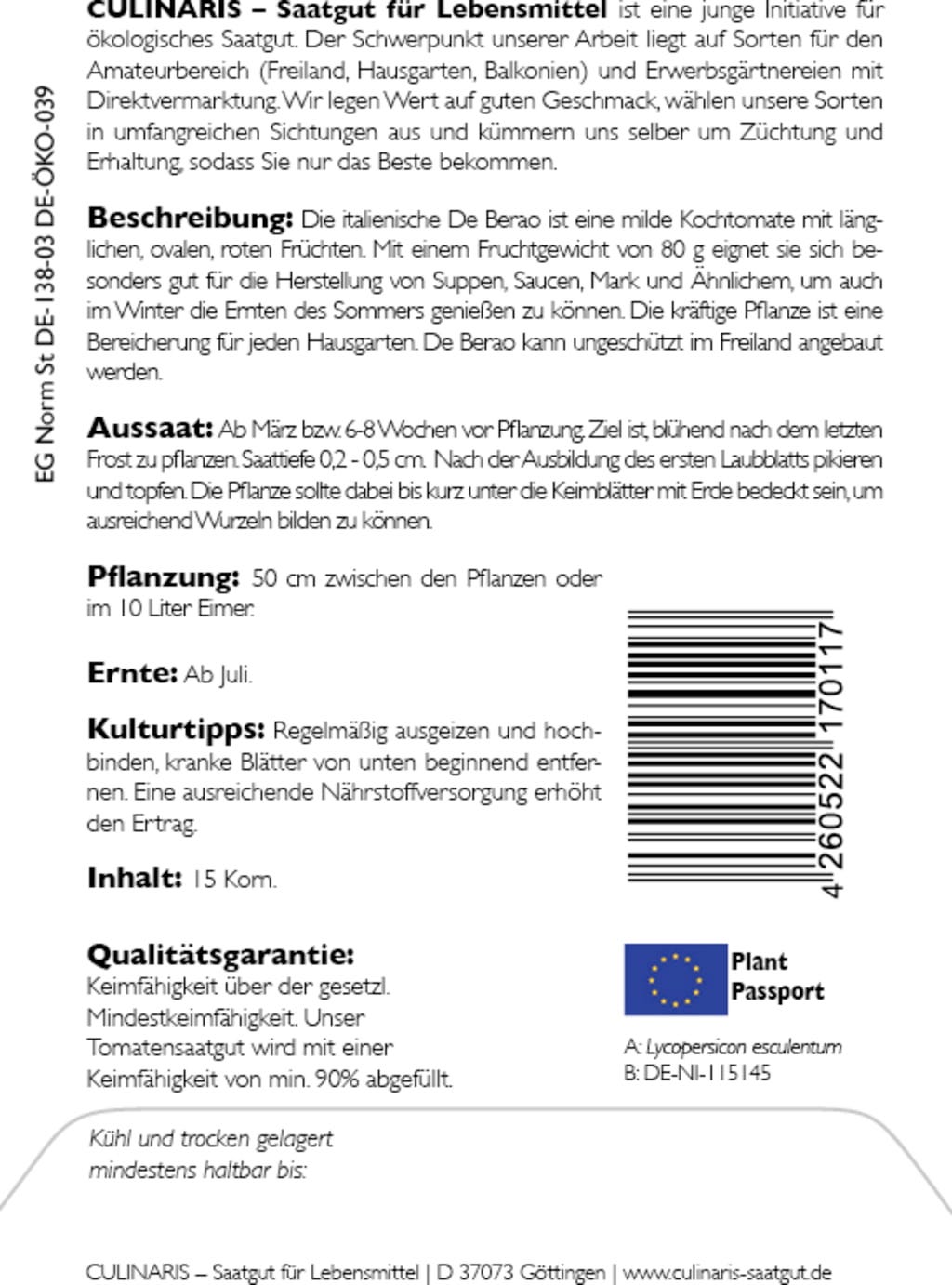 | Tillverkare: | Culinaris - Saatgut für Lebensmittel, Thiegasse 5, 37124, Rosdorf, Tyskland, info@culinaris-saatgut.de, culinaris-saatgut.de |