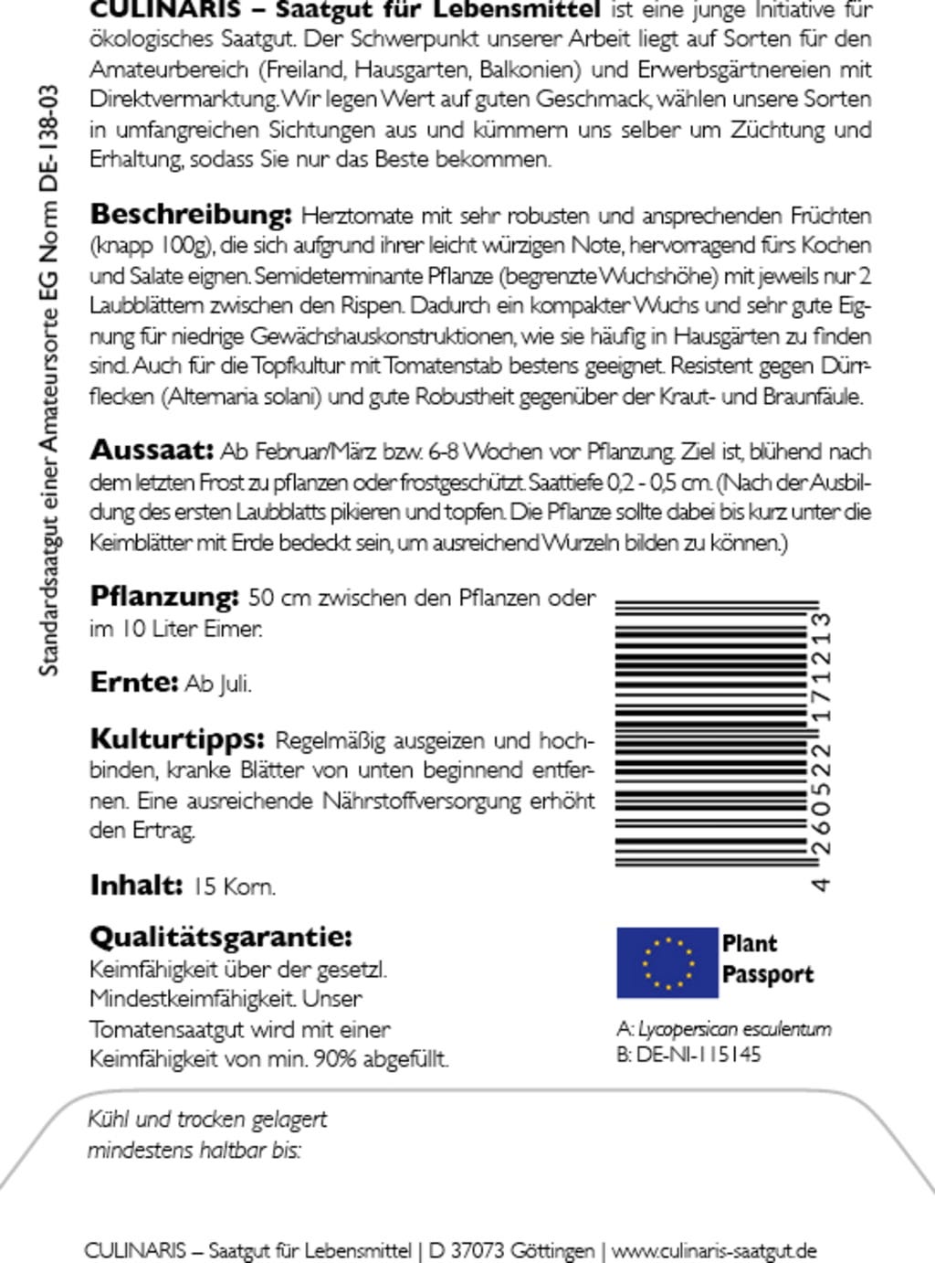 | Tillverkare: | Culinaris - Saatgut für Lebensmittel, Thiegasse 5, 37124, Rosdorf, Tyskland, info@culinaris-saatgut.de, culinaris-saatgut.de |