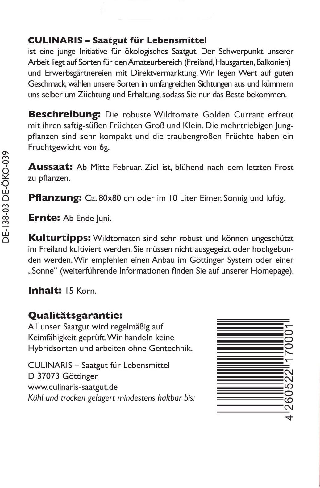 | Tillverkare: | Culinaris - Saatgut für Lebensmittel, Thiegasse 5, 37124, Rosdorf, Tyskland, info@culinaris-saatgut.de, culinaris-saatgut.de |