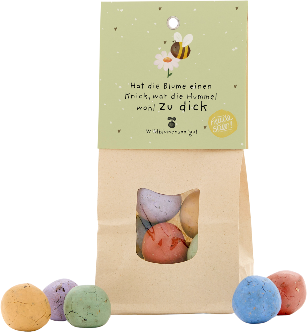 Den här skojigt designade påsen innehåller 8 vildblomkulor och bjuder med sin humoristiska text garanterat på ett leende. Bara att sprida, vattna – och snart växer ett färgsprakande blomsterhav fullt av lätthet. En originell gåva till alla med sinne för humor. Perfekt för balkong, trädgård eller kruka – och såklart helt utan plast.