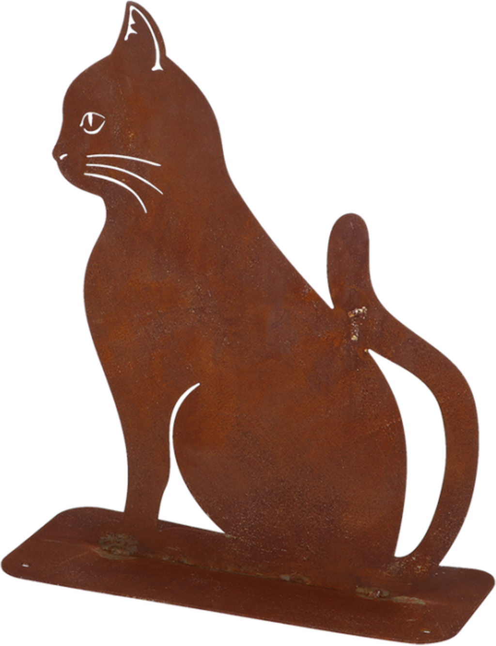 Denna laserskurna trädgårdsfigur föreställer en sittande katt i elegant rostuk. Ytan åldras vackert och får med tiden en naturlig patina som förstärker dess rustika charm. Tack vare den plana basen kan figuren enkelt placeras i rabatter, krukor eller på terrassen.