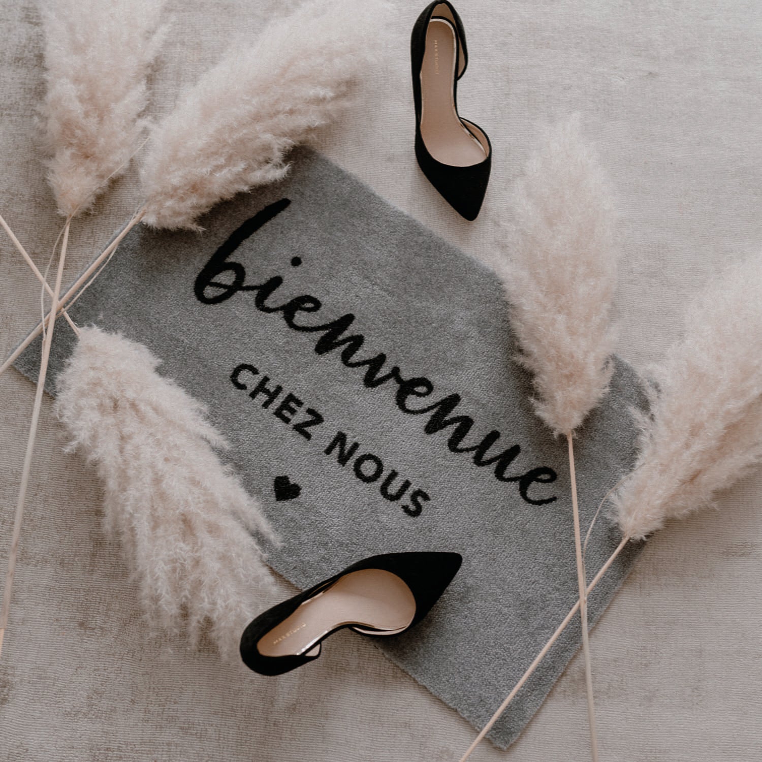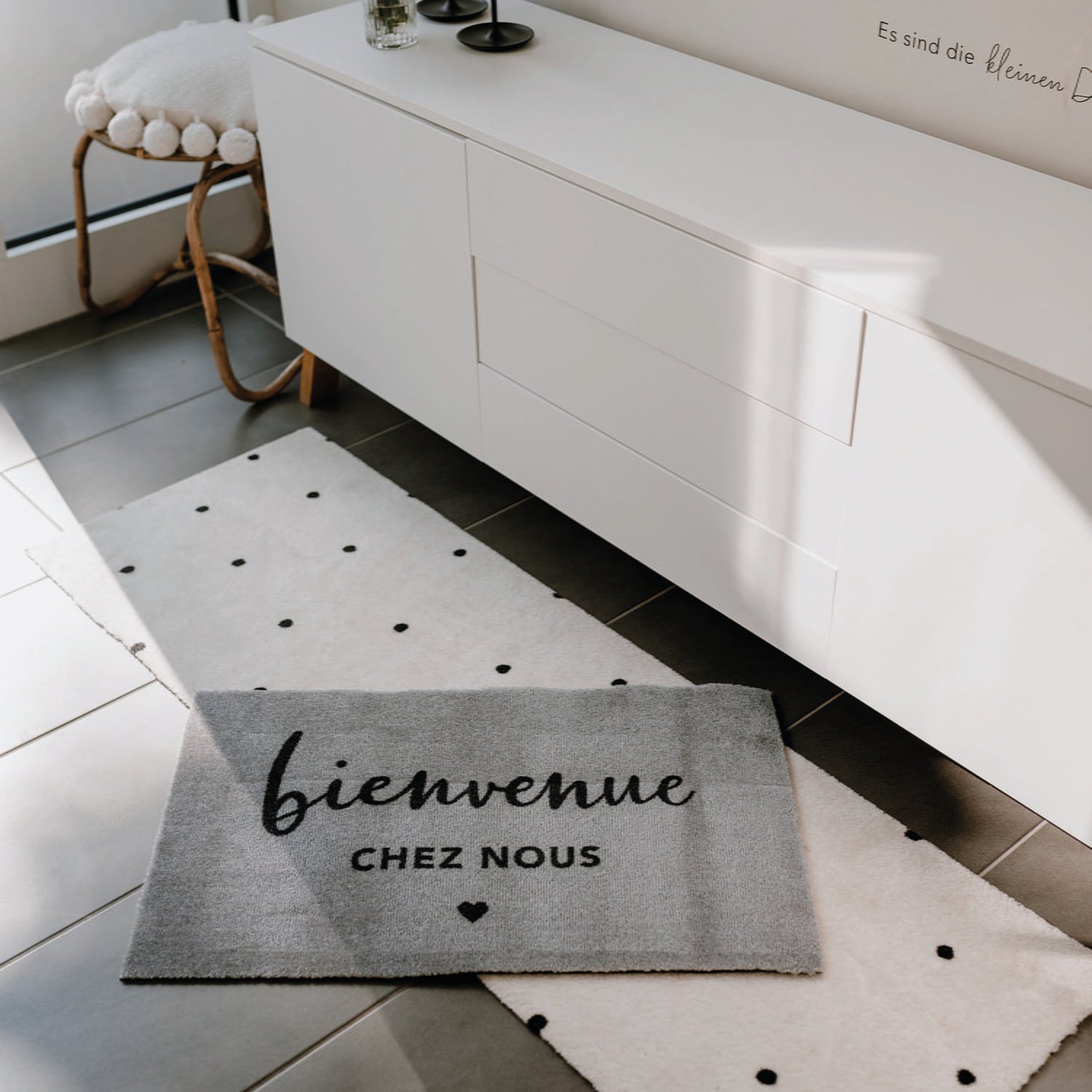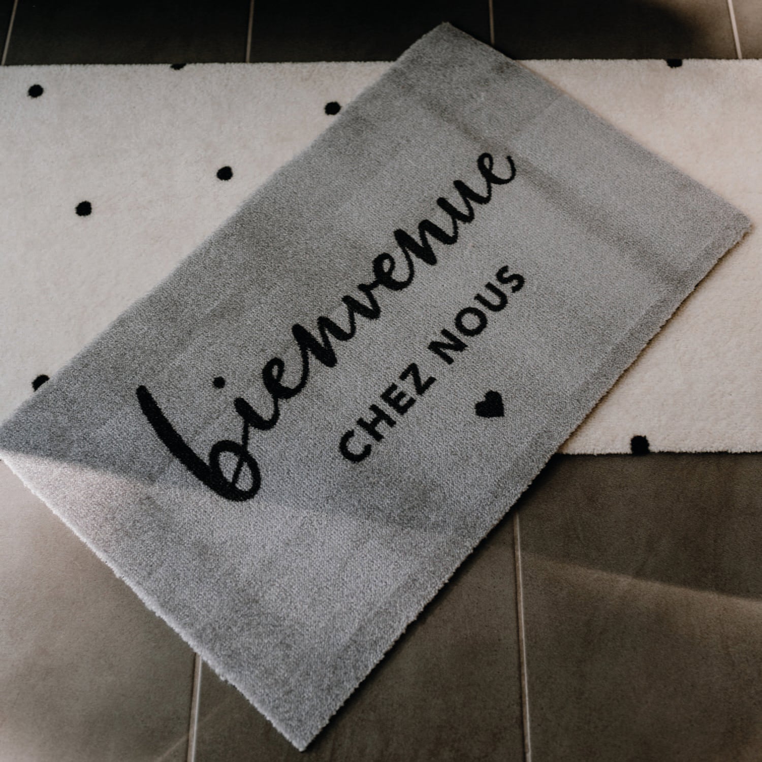 Hur kan du hälsa dina gäster vänligare än med "Välkommen till vårt hem". Den maskintvättbara dörrmattan med den kärleksfullt utformade franska texten inspirerar inte bara visuellt, utan även med sina utmärkta bruks- och skötselegenskaper, eftersom den kan tvättas i maskin.