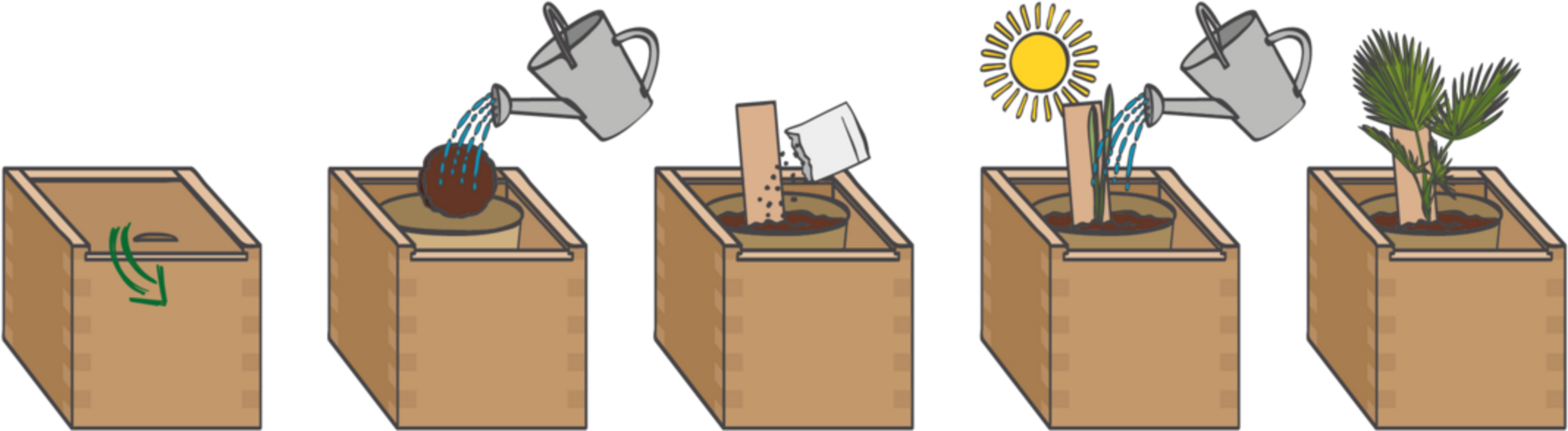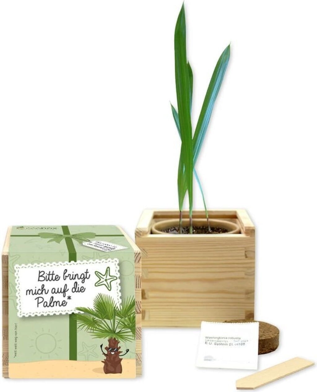Med ecobox "Palm" får du inte bara en vanlig krukväxt. Du odlar fram din egen palm från grunden! Och medan den växer, kan du drömma dig bort till varmare breddgrader med sand mellan tårna och havsbrus i öronen. Men glöm inte att öppna ögonen igen då din palm behöver vattnas!