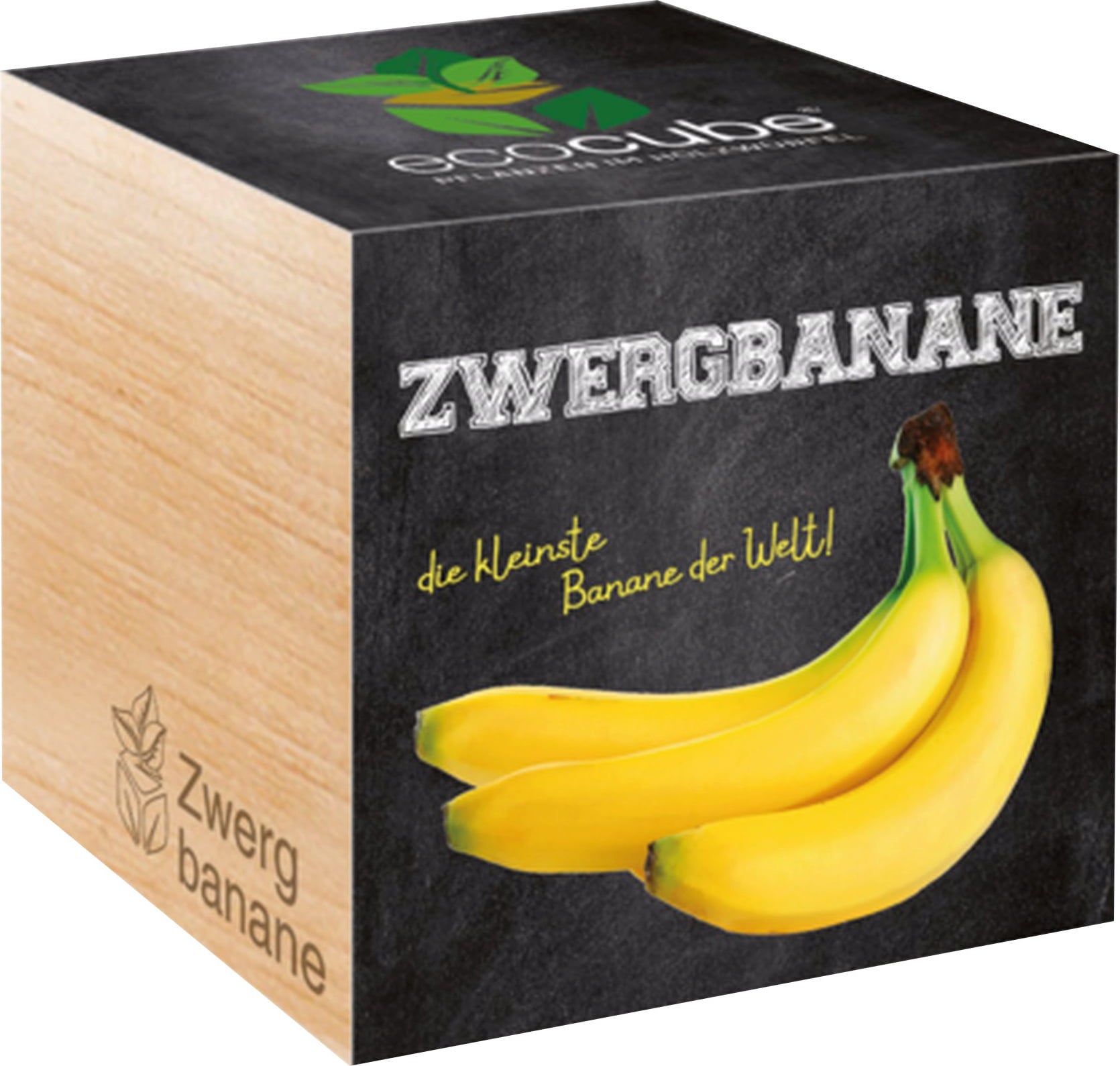 En ovanlig och exotisk gåva: Med ecocube kan du odla din egen dvärgbanan hemma! Den naturliga träkubben innehåller allt som behövs. Tillsätt bara vatten, ställ ljust och låt växten gro. En perfekt kombination av design och hållbarhet.