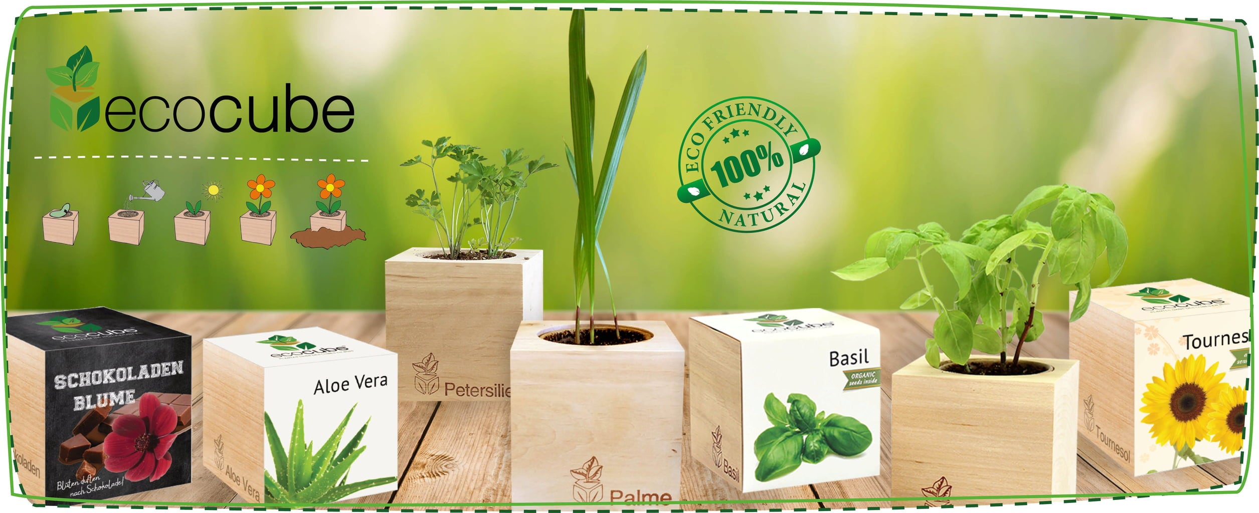 I den dekorativa träkuben utvecklas fröna till växter eller örter. Kuben tillverkas av högkvalitativt alträ, är fylld med ett speciellt näringsgranulat och frön, och är förseglad med ett groddskyddande klistermärke.
