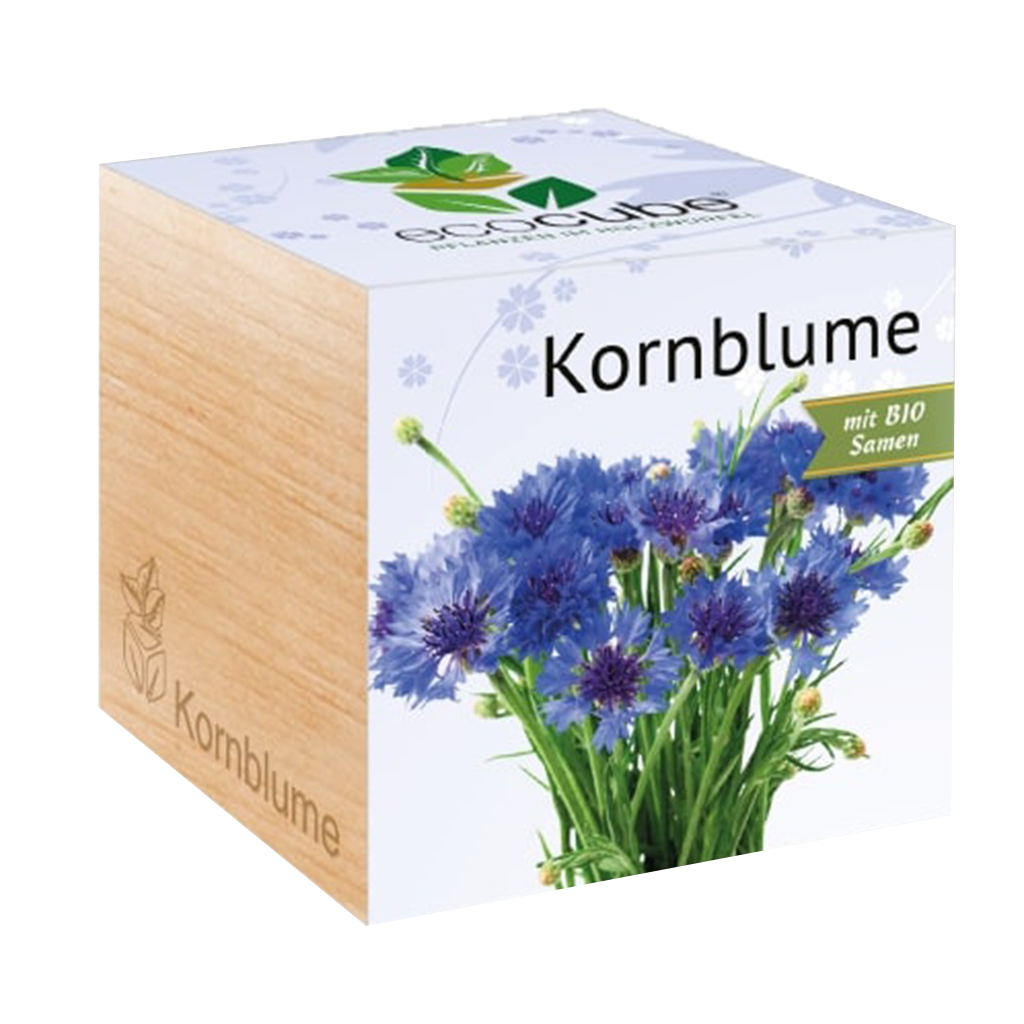 Den djupa, lysande blå färgen hos kornblomman är en fröjd för ögat. Särskilt när du får följa dess tillväxt dag för dag. Med den helt komposterbara ecocuben, fylld med ekologiskt certifierade frön och ett särskilt växtgranulat i en vacker träkub av alträ, är odlingen både enkel och dekorativ. Kornblomman är snabbväxande och färgstark, med tätt fyllda blommor som ger liv åt fönsterbrädan eller balkongen. Efter några månader kan hela kuben planteras i en kruka där den sakta bryts ner och förvandlas till värdefull näring för växten.
