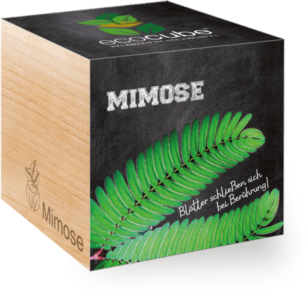 En levande present! Mimosan är också känd som ”känselväxt” eftersom den stänger sina blad vid beröring eller vid starka vindpustar. Med denna ecocube av hållbart alträ kan du enkelt odla mimosan själv. Fröna och alla viktiga näringsämnen ingår redan i kuben.