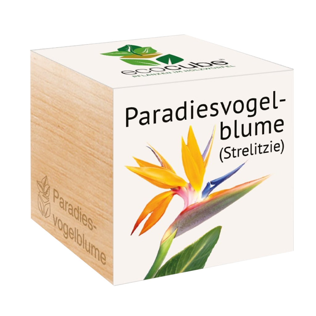 Kungsstrelitzian är en populär och dekorativ krukväxt även hos oss. Med sina färgstarka blommor, som liknar en paradisfågel, ger den snabbt en exotisk känsla till ditt hem. ecocube är tillverkad av högkvalitativt alträ och innehåller näringsrikt granulat samt fröer, förseglade med en groningssäker etikett. Hela kuben kan planteras direkt i kruka, eftersom den är helt komposterbar förvandlas den gradvis till näring för växten.