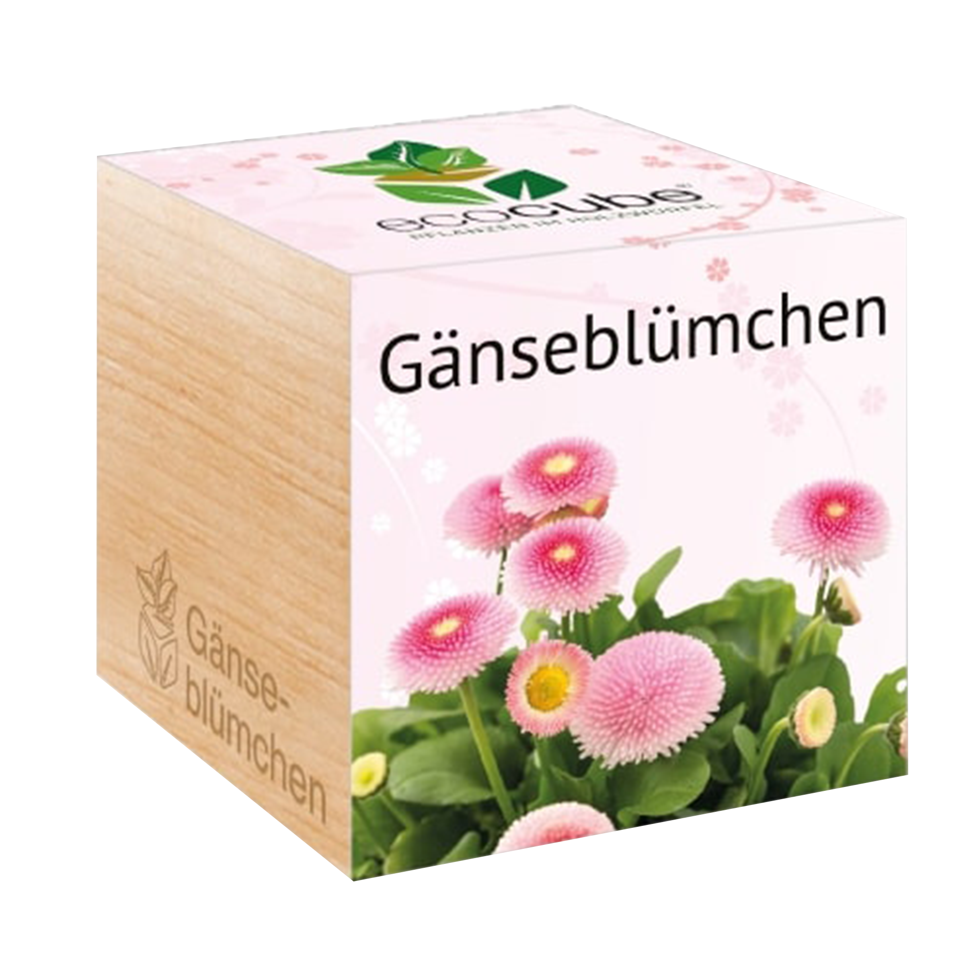Med ecocube kan du enkelt odla din egen tusensköna. Denna helt komposterbara kub i alträ innehåller frön och ett särskilt växtgranulat. Efter cirka 8 månader kan hela kuben planteras ut i trädgården.