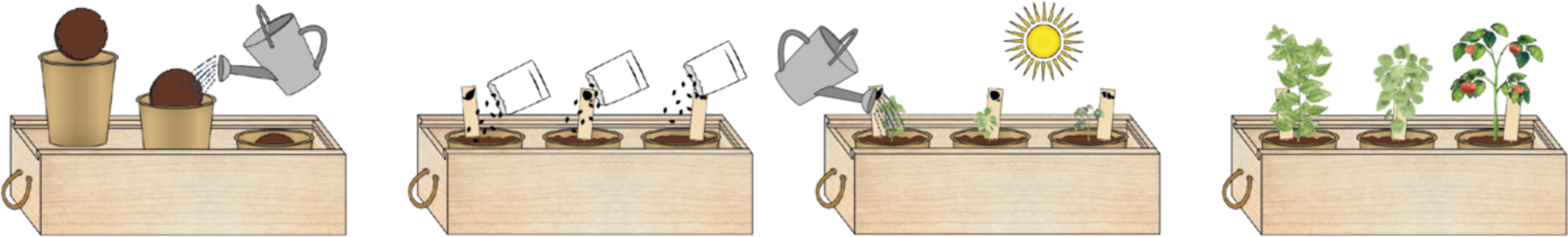 - Placera planteringskärlen i trälådan och fyll dem med kokosfiberbriketter.