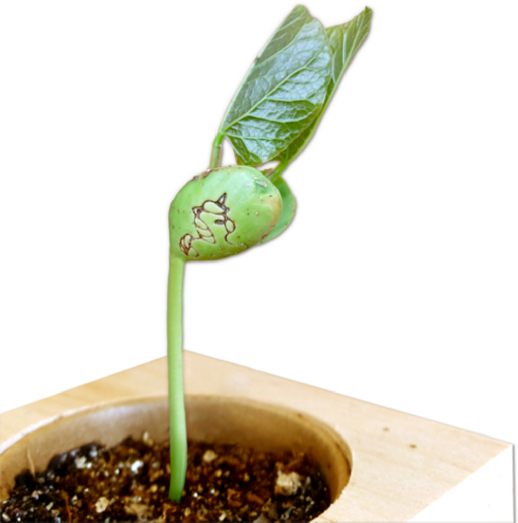 Kuben innehåller en så kallad jackbean eller jätteböna, som utvecklas till ett "litet enhörningsträd".