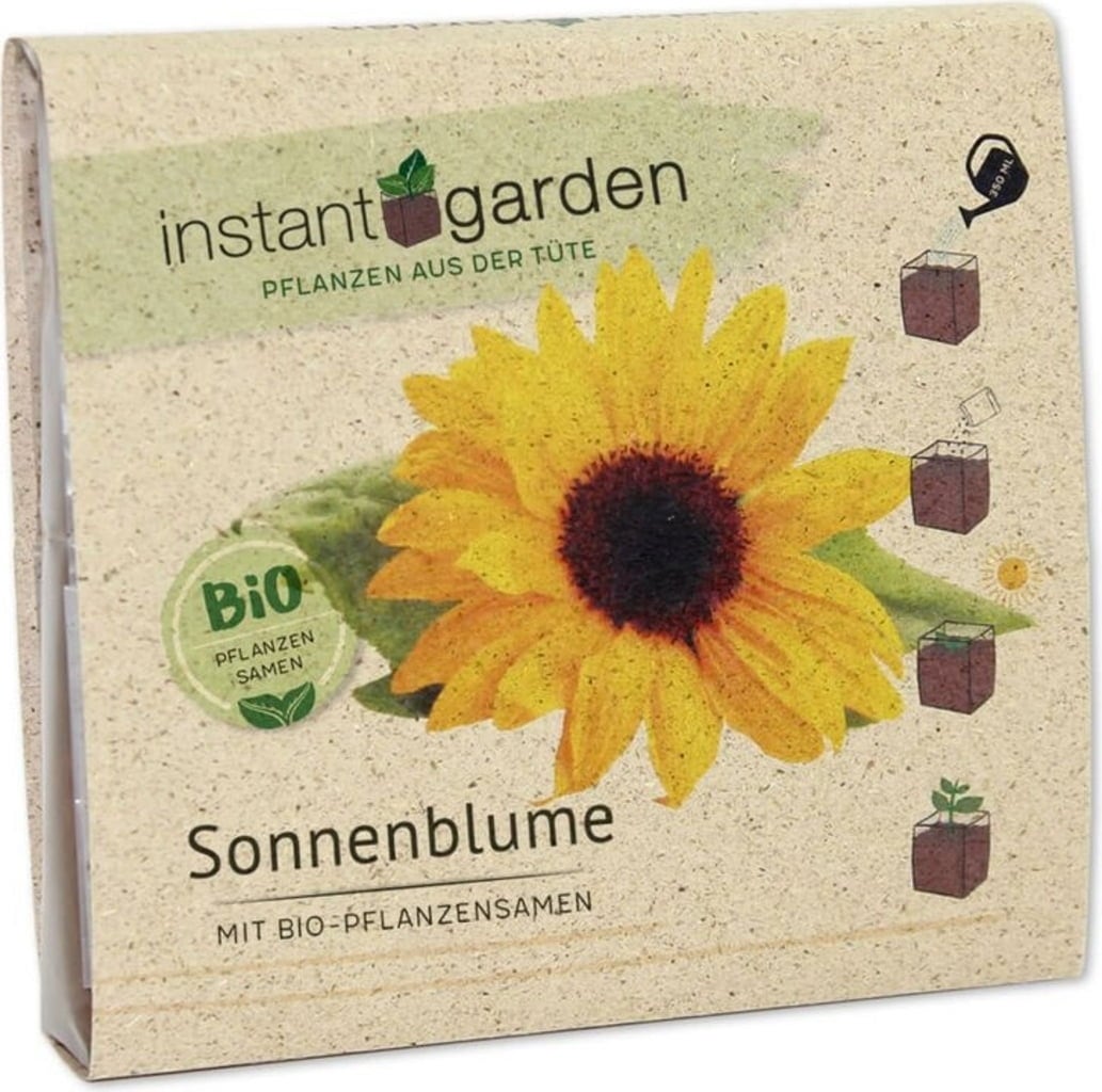 Med instant garden kan du enkelt odla din egen solros på fönsterbrädan. Den nätta dvärgsolrosen med sina lysande gula kronblad sprider garanterat glädje i ditt hem. Setet innehåller redan allt du behöver för odlingen. Du behöver bara tillsätta vatten. Det lilla paketet med sitt blommande innehåll passar dessutom perfekt som en uppskattad present.