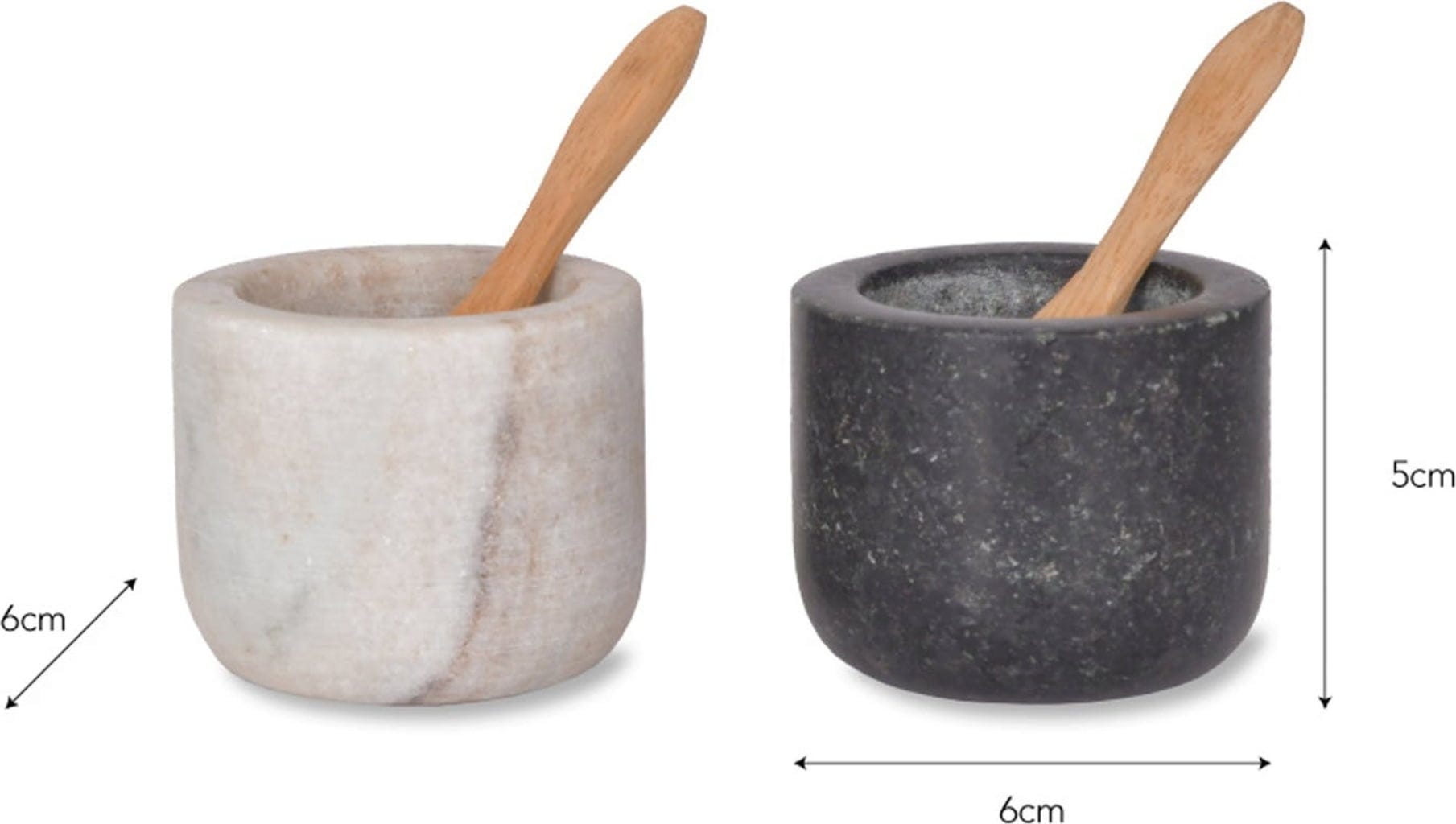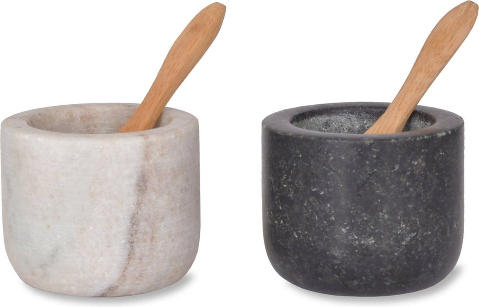 Denna duo är ett elegant sätt att servera salt och peppar. Kombinationen av marmor och granit ger en unik look och gör setet till ett tydligt blickfång på bordet. De små bambuskedarna kompletterar helheten och gör det enkelt att dosera rätt mängd krydda.