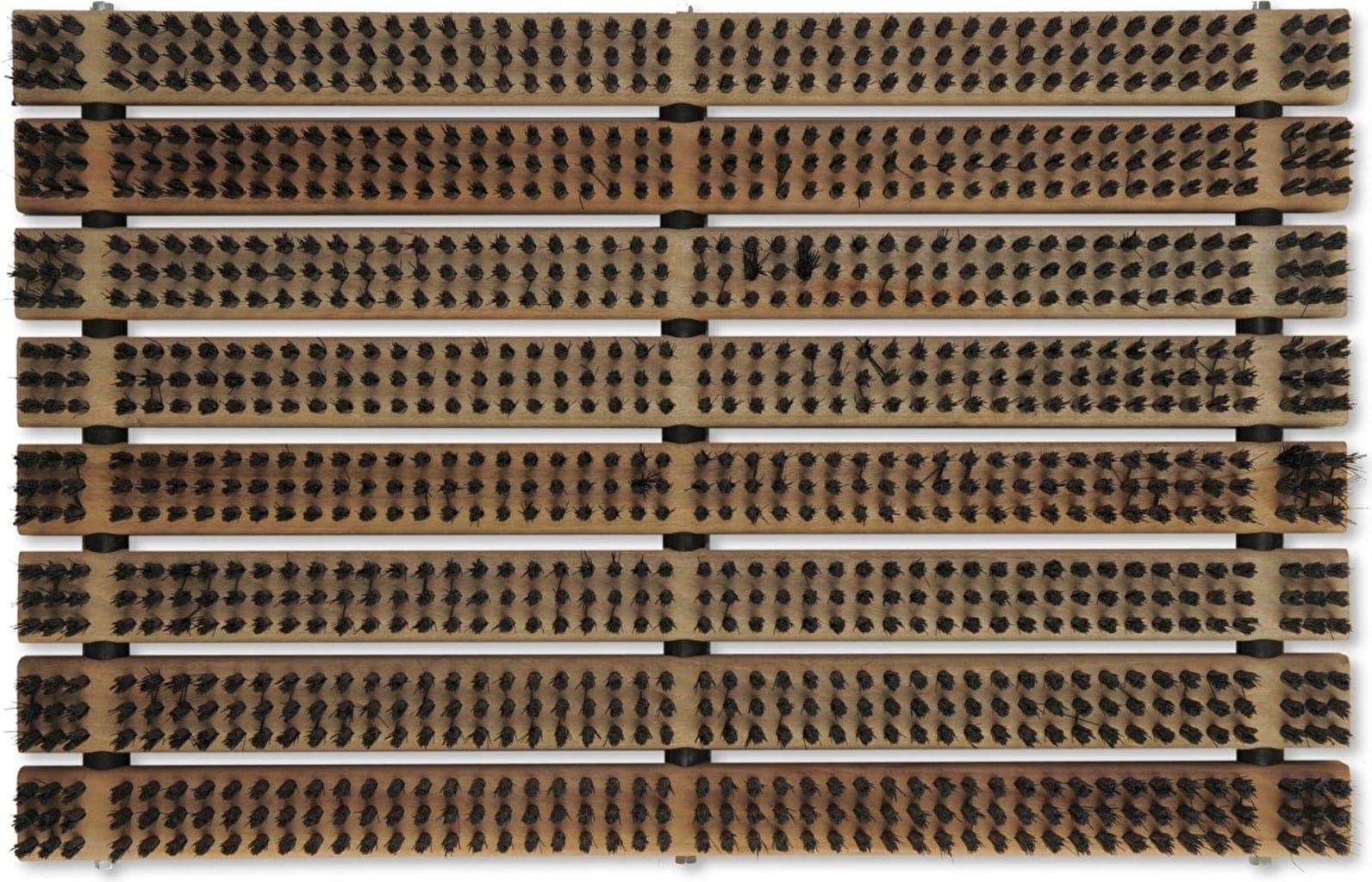 Detta skrapgaller på en träram är extra slitstark och med sina långa borst perfekt för att ta bort grov smuts från skor och stövlar. Träramen gör den dessutom betydligt stabilare än vanliga dörrmattor och ger ett bättre grepp. Kontrasten mellan ljust trä och mörka borst ger den en rustik charm som gör den till en stilfull detalj i hemmet.