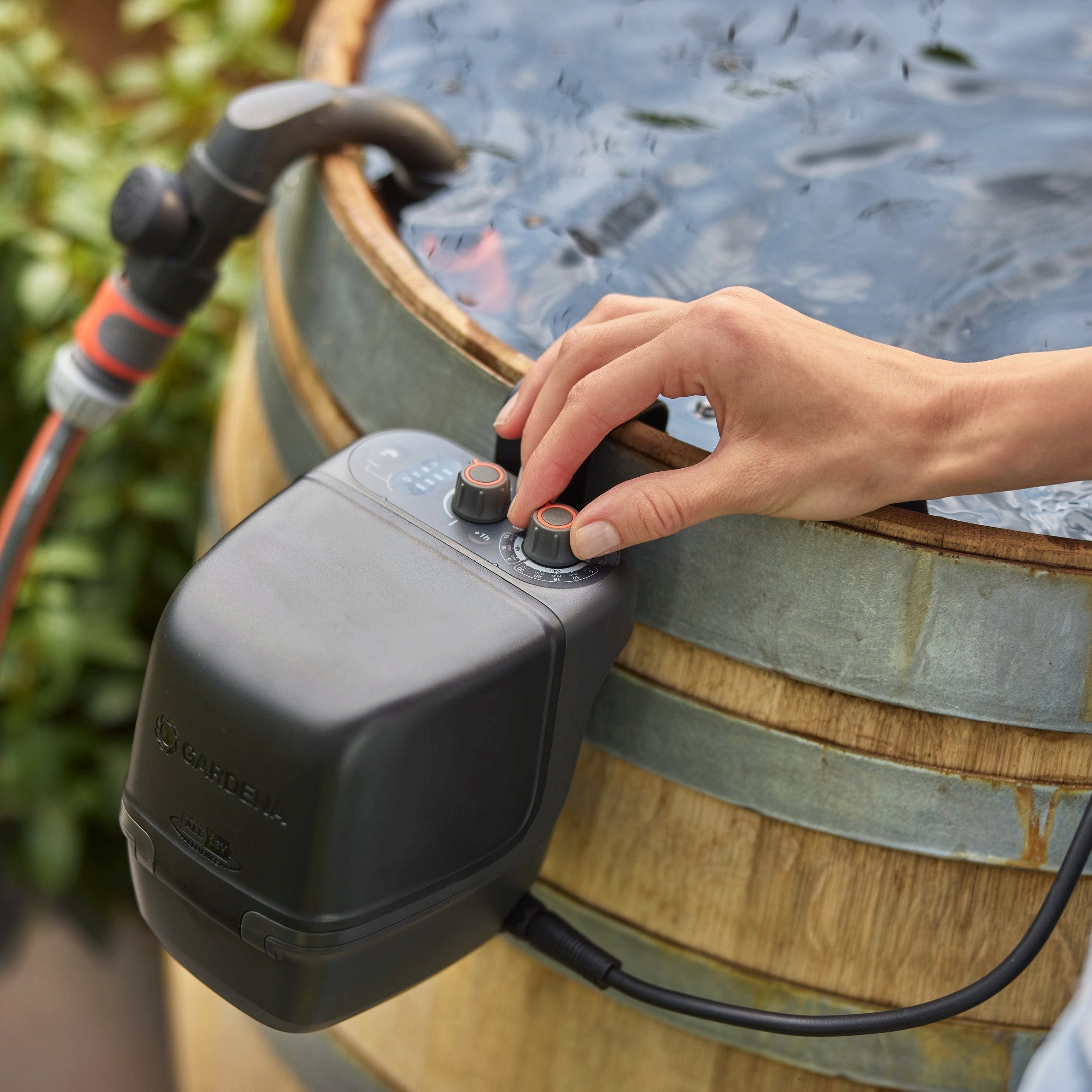 Använd ditt uppsamlade regnvatten mer effektivt och bekvämt än någonsin tidigare. Med Ready-to-Use-setet är du redo direkt! Pumpen levererar med 2,2 bar ett kraftfullt tryck för duschmunstycken, sprutor eller små sprinklers. Tack vare den smala konstruktionen passar den i nästan alla öppningar (från 100 mm) och är därmed den perfekta lösningen för IBC-behållare och klassiska regntunnor.