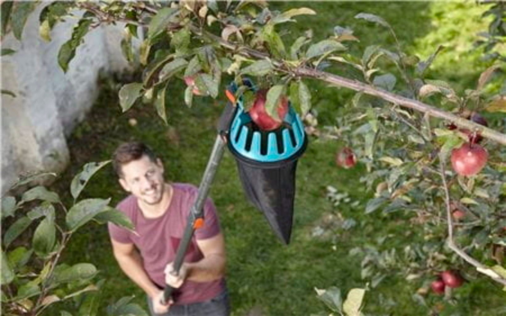 Med denna fruktplockare kan du enkelt och bekvämt plocka frukt direkt från trädet utan stege. För att nå frukt på högre grenar rekommenderar vi att komplettera med combisystem teleskopskaft.
