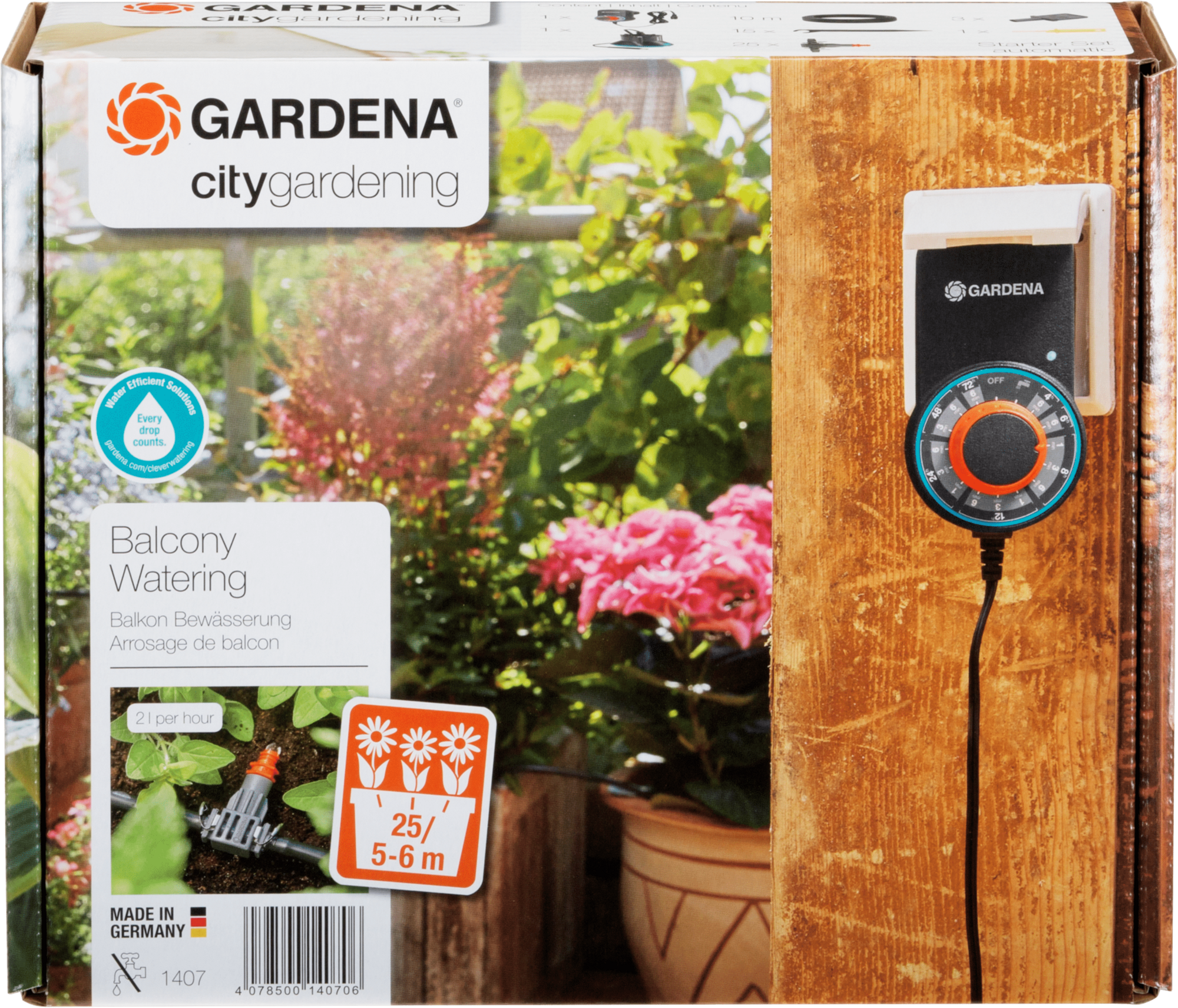 Med detta bevattningssystem kan upp till 6 m blomlådor bevattnas helautomatiskt. Bevattningen startas datorstyrt och vattenflödet slås automatiskt på och av.