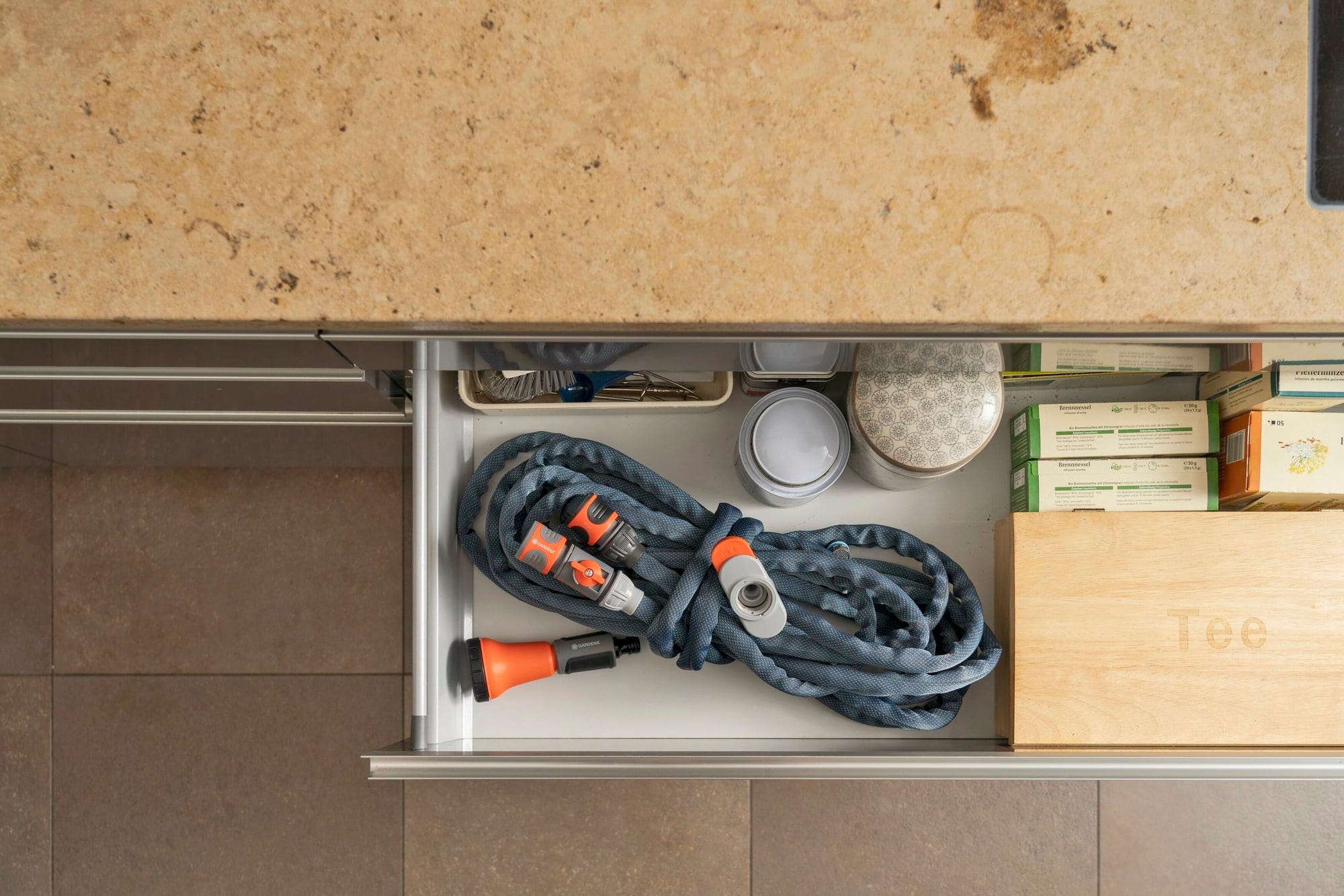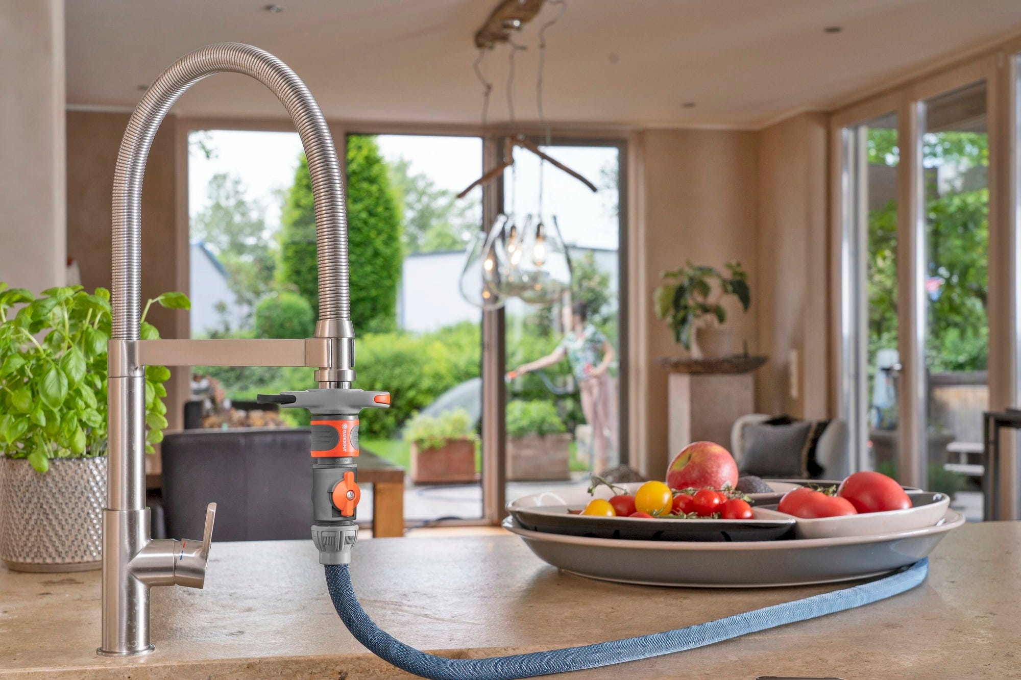 Med detta set kan du även ansluta en bevattningsslang inomhus. Perfekt för att vattna dina växter på balkongen eller terrassen. Tack vare den speciella krankopplingen kan du enkelt ansluta Liano™ textilslang till en vanlig inomhuskran. Yttermaterialet i textil skyddar även känsliga ytor så att din inredning förblir oskadd vid användning.