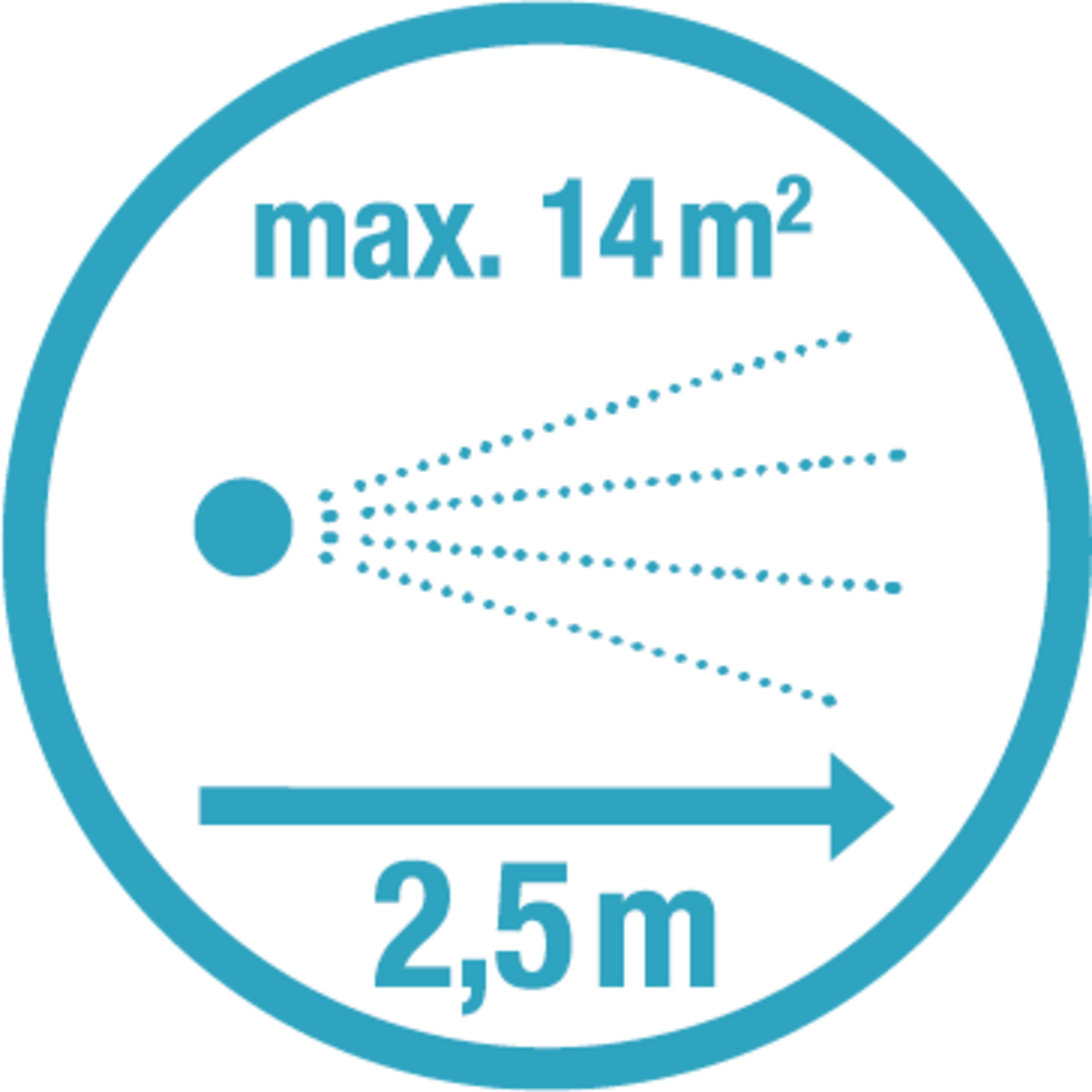 | 180° sprutmunstycke | 2,5 m | 14 m² |