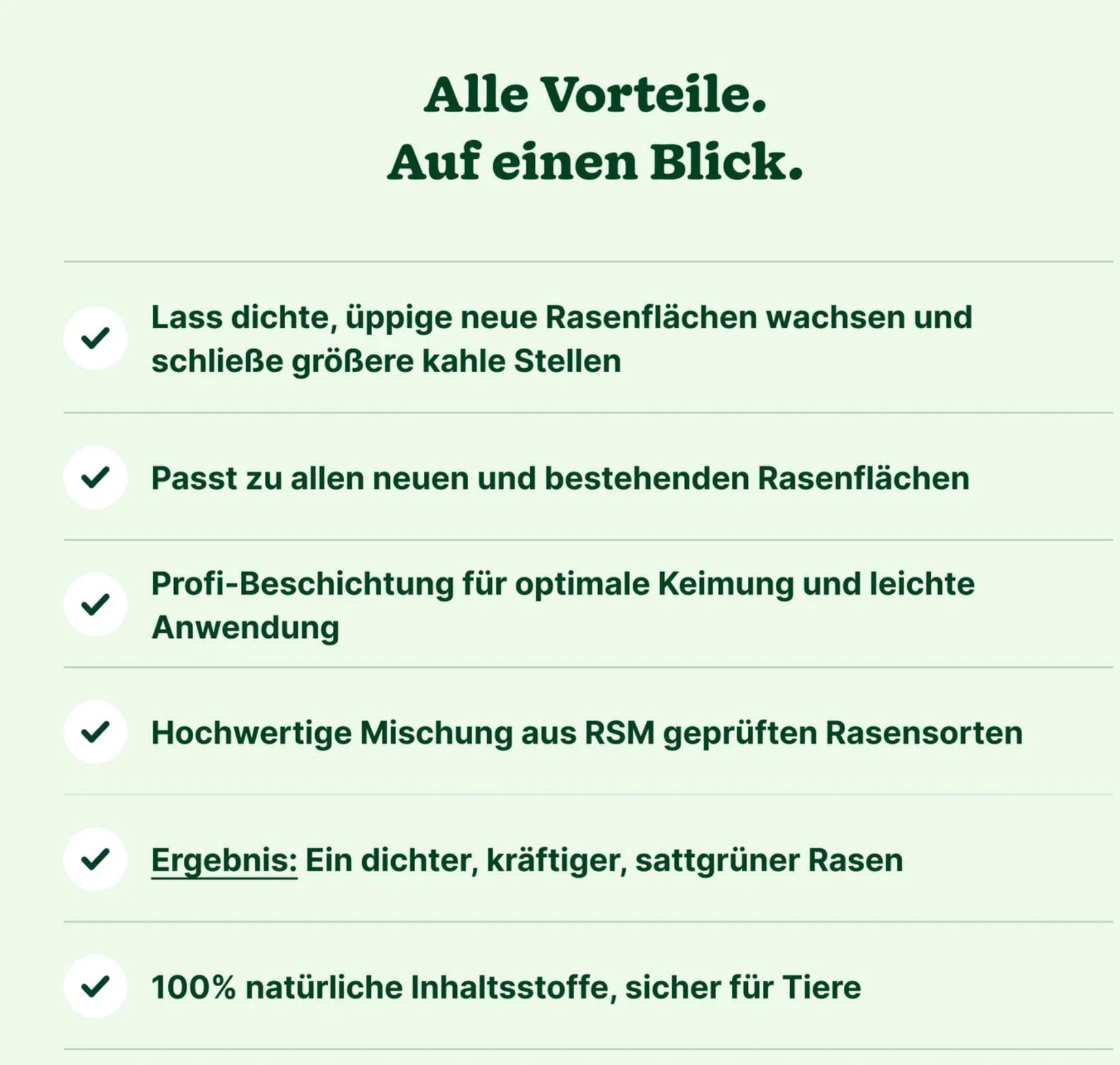 Med kraftsådd blir din gräsmatta inte bara grön utan också tillräckligt stark för alla aktiviteter. Oavsett om det gäller fotboll, picknick eller trädgårdsfest växer fröna snabbt, bildar täta gräsytor och reparerar kala fläckar effektivt. Resultatet blir en slitstark och frodigt grön mattliknande gräsmatta.