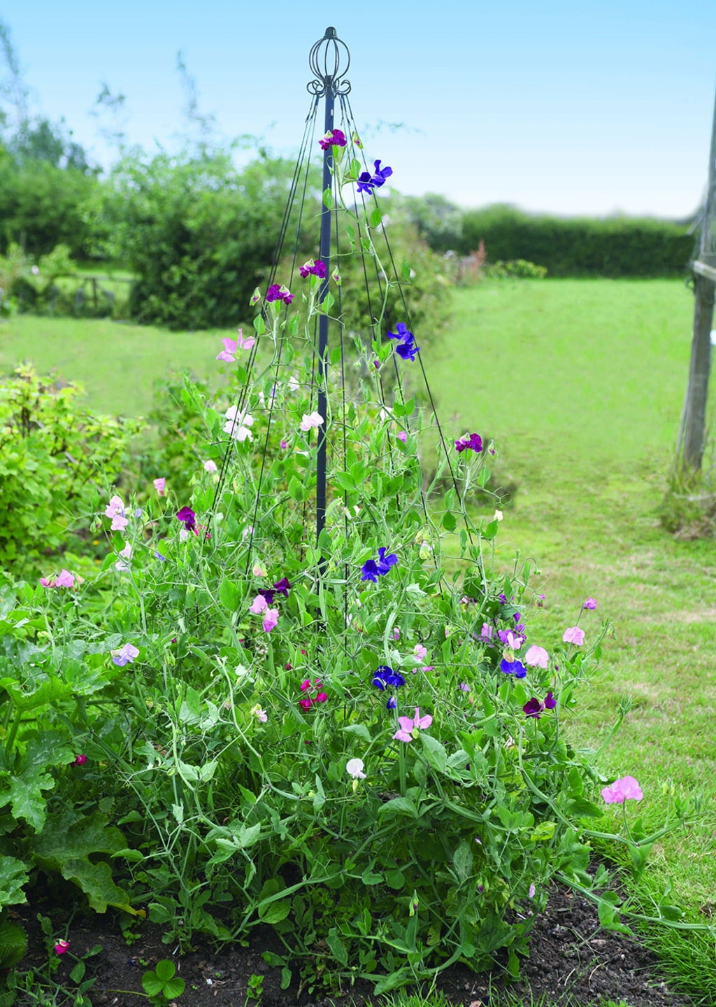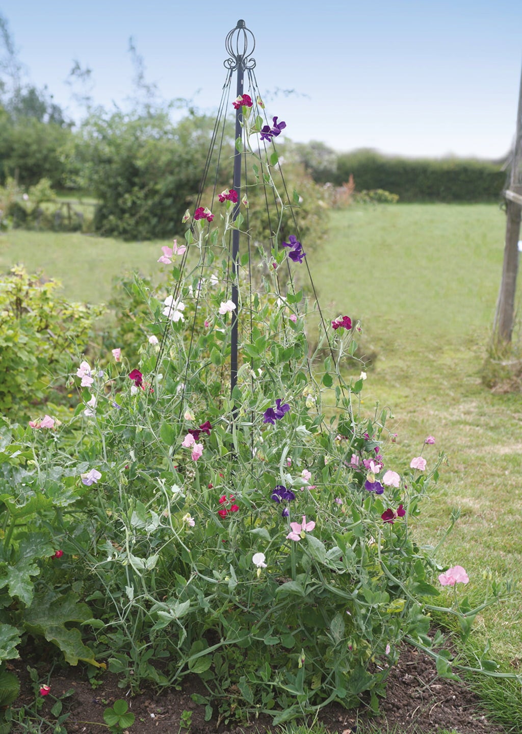 Elegant och mångsidig. Denna pulverlackerade stålställning påminner om en majstång och är perfekt för både ettåriga och fleråriga klätterväxter som luktärter eller störbönor. Den är enkel att använda: placera majstången över dina växter och fäst dem längs stängerna. Ställningen kan justeras i höjd efter växternas tillväxt.