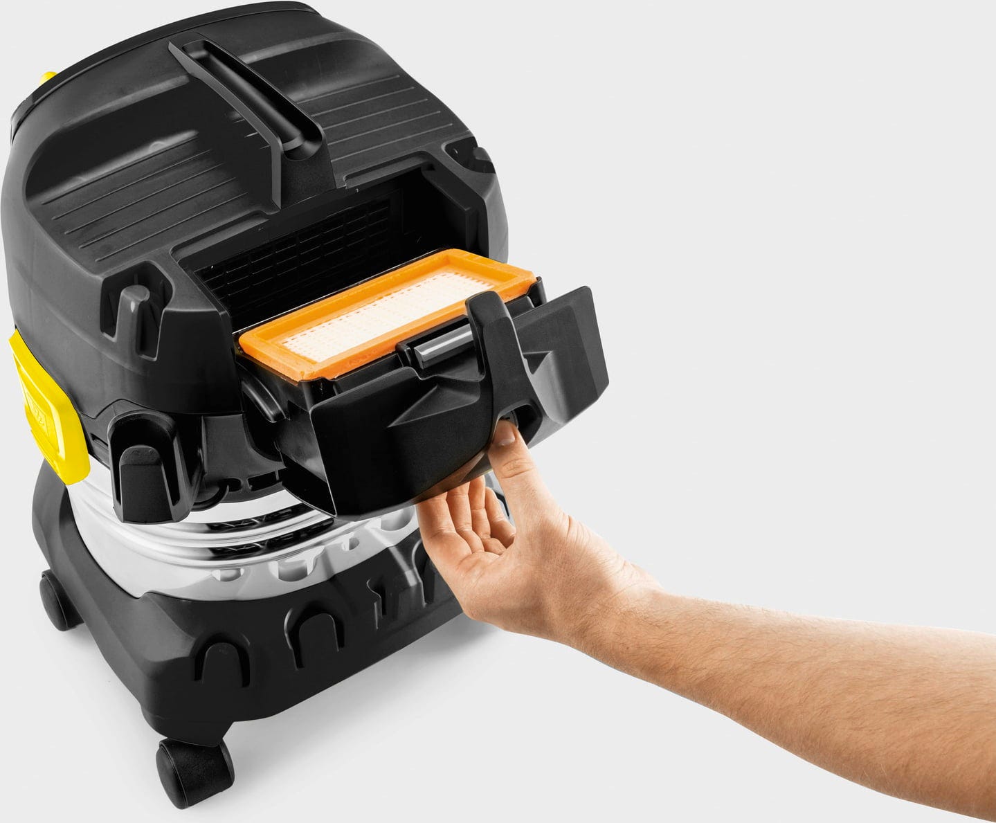 Kärcher WD 4 S Go!Further är en limiterad version i svart och passar för mångsidiga rengöringsuppgifter inom verkstad, renovering och fordonsvård. Med en sugeffekt på 240 W arbetar enheten energieffektivt och tar upp både torr och våt smuts på ett tillförlitligt sätt. Den 20 liters behållaren i rostfritt stål är robust och anpassad för medelstora mängder smuts, perfekt för hemmafixare, garage eller källare.