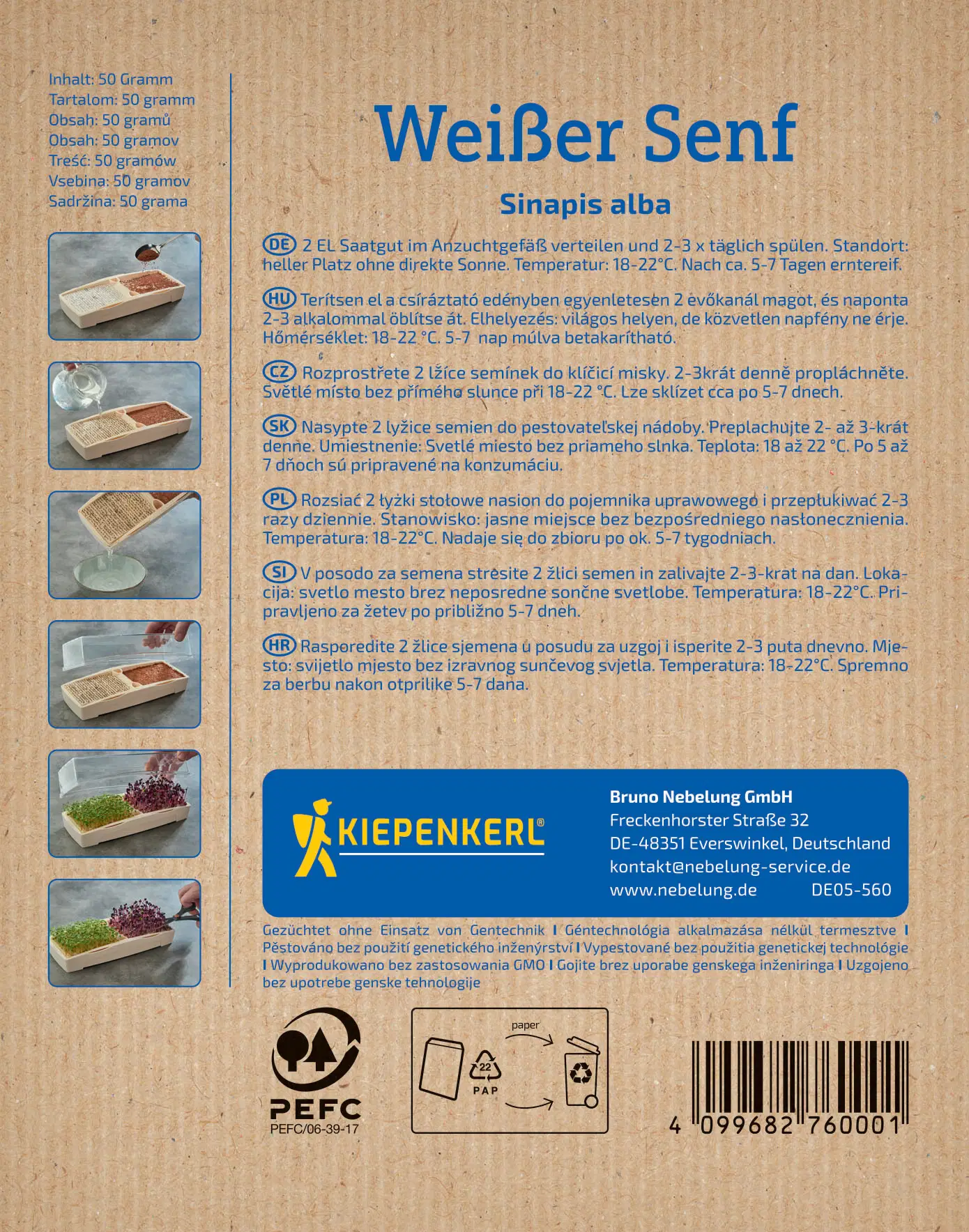 Vit senap tillför en intensiv hetta i köket! De ekologiska fröna kan odlas till smakrika microgreens året runt. Redan efter 5–8 dagar är de små plantorna klara att skörda – perfekta till sallader, smörgåsar eller soppor. Har du bråttom? I MicroGreen Duo-Garden gror de redan efter 3–5 dagar – starkt, fräscht och nyttigt, direkt från egen odling.