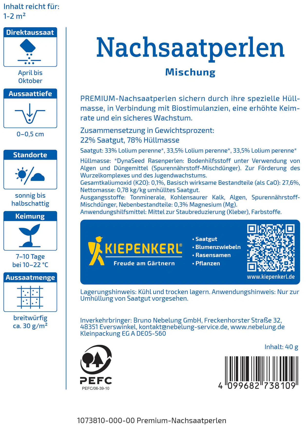 Kiepenkerl Profi-Line Premium Återväxtpärlor använder DynaSeed®-teknologi för hög grobarhet och sund tillväxt i starten. Det inkapslade fröet innehåller biostimulanter, mikronäringsämnen och naturliga mineraler som ger god jordkontakt, minskat fågelplock och snabb, tät grästillväxt. Perfekt för att förbättra befintliga gräsytor i trädgården - strö ut och njut av en välvårdad, grön gräsmatta.